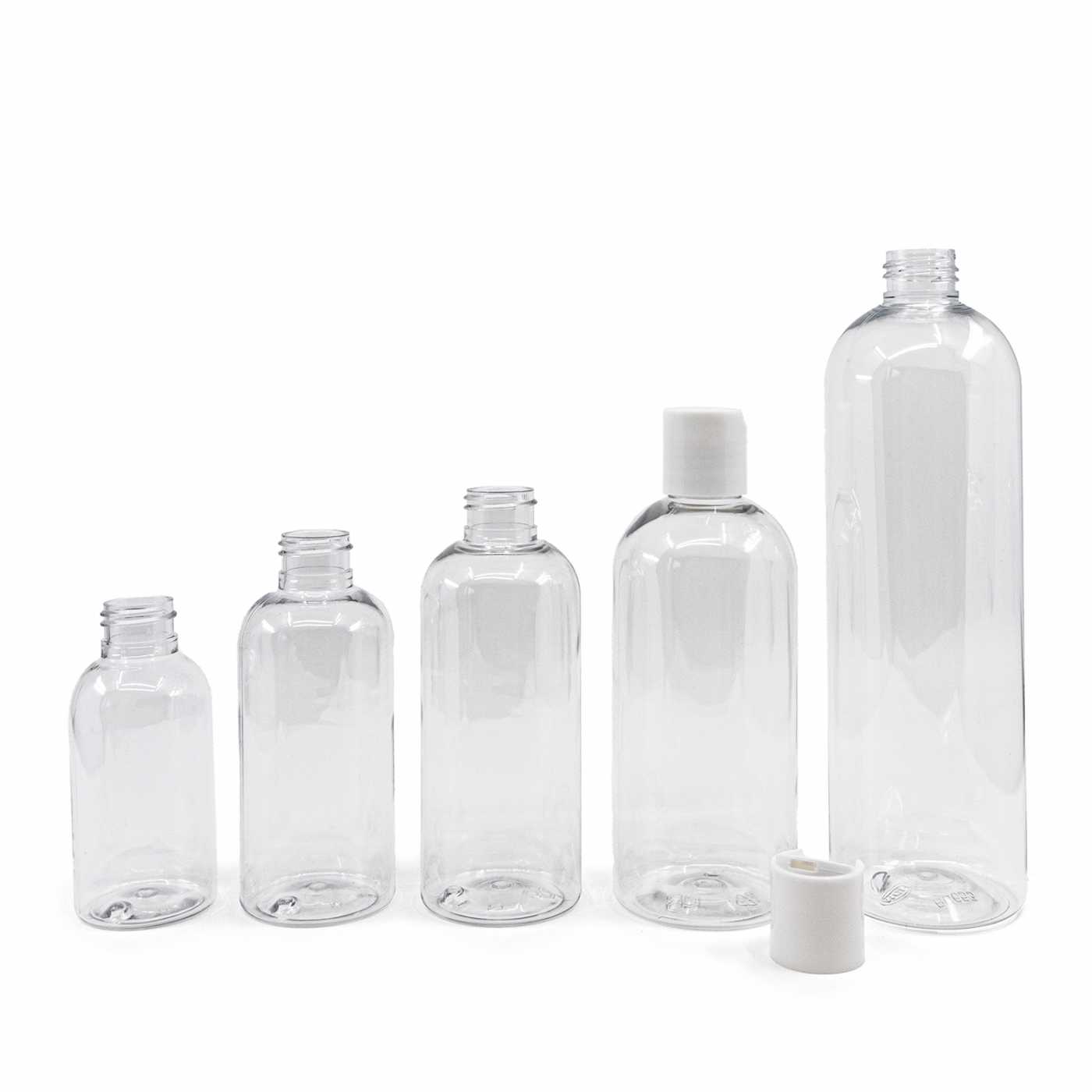 Transparente Kunststoffflasche, ideal für die Aufbewahrung einer Vielzahl von Flüssigkeiten, Ölen, Lotionen usw. Sie ist halbsteif, lässt sich aber zusammendrücken.