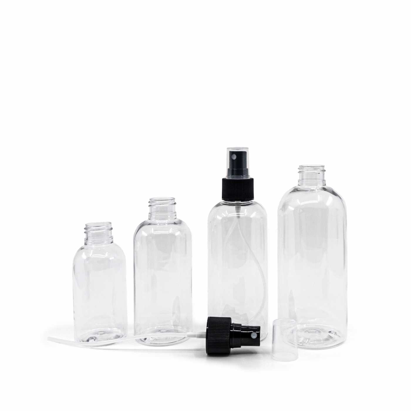 Schwarzer Kunststoffspender - gerändelt mit transparenter Kappe, geeignet für Flaschen mit Halsdurchmesser 24 mm.