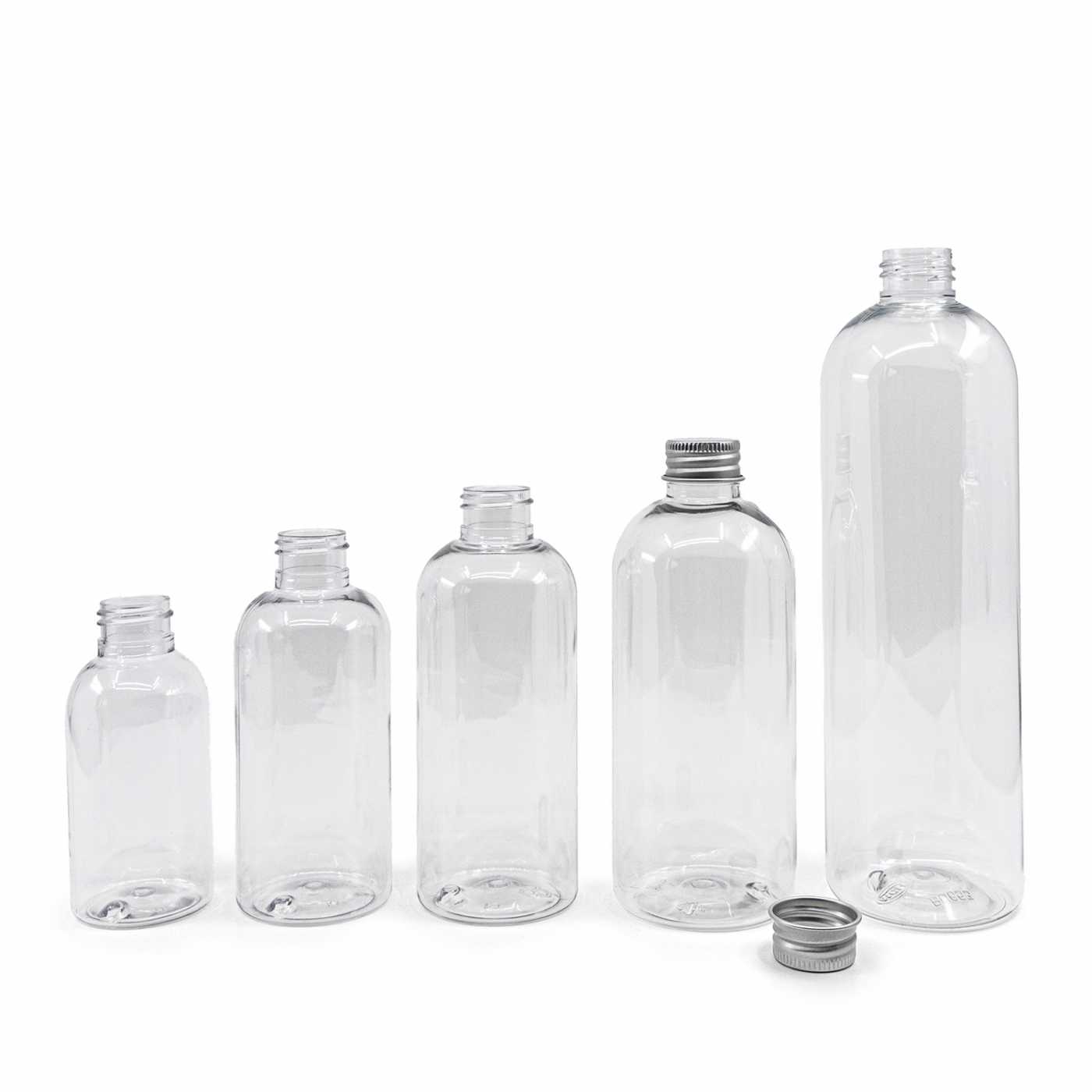 Abgerundete, klare Kunststoffflasche, silberner Aluminiumverschluss, 100 ml