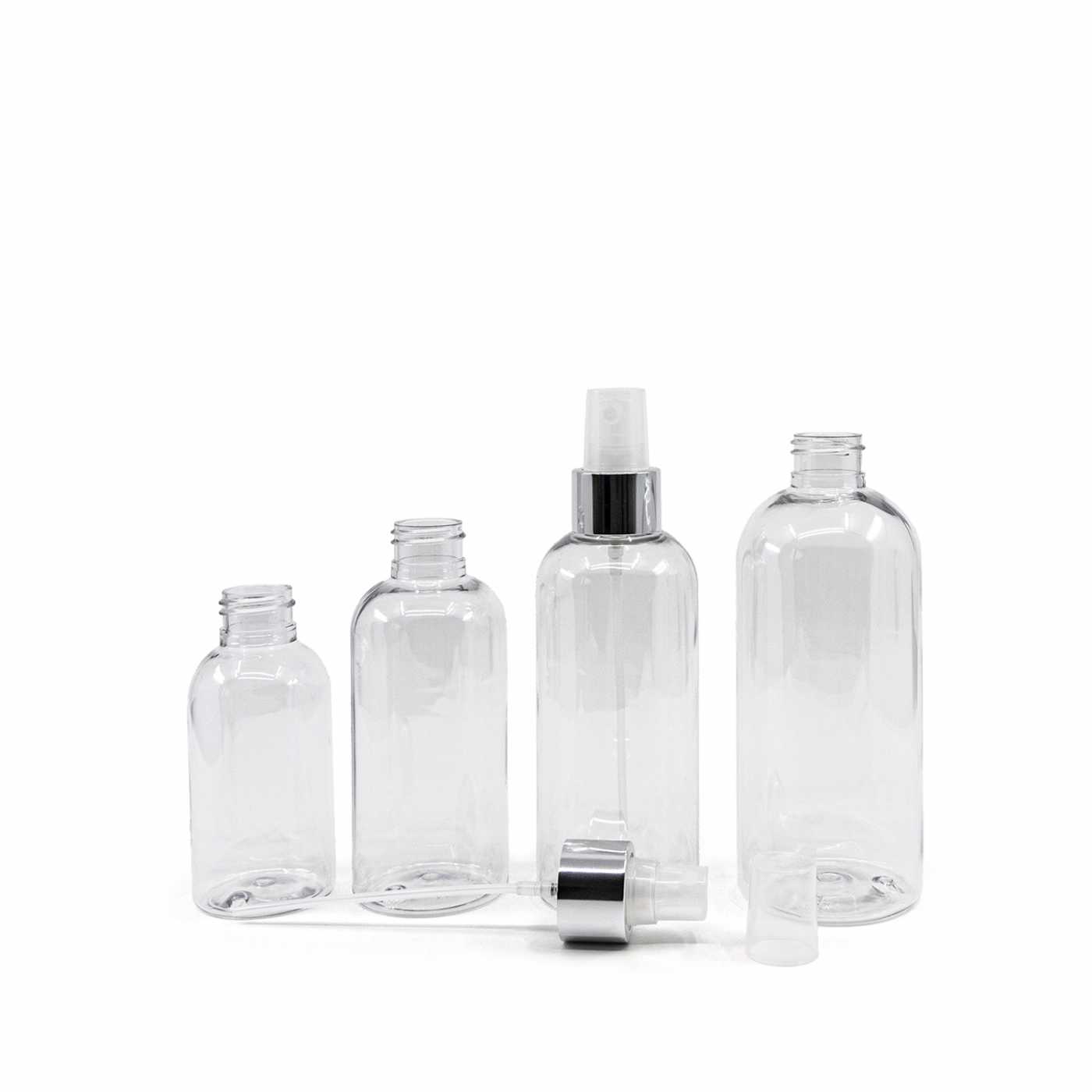 Abgerundete, klare Kunststoffflasche, Transparentes Spray mit glänzendem Silberkragen, 100 ml