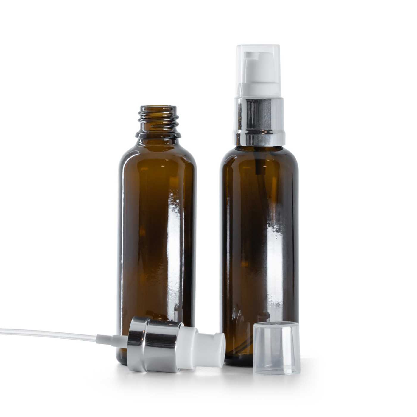 Ambre Glasflasche, schlank, silberglänzend, weiße Pumpe, 50 ml