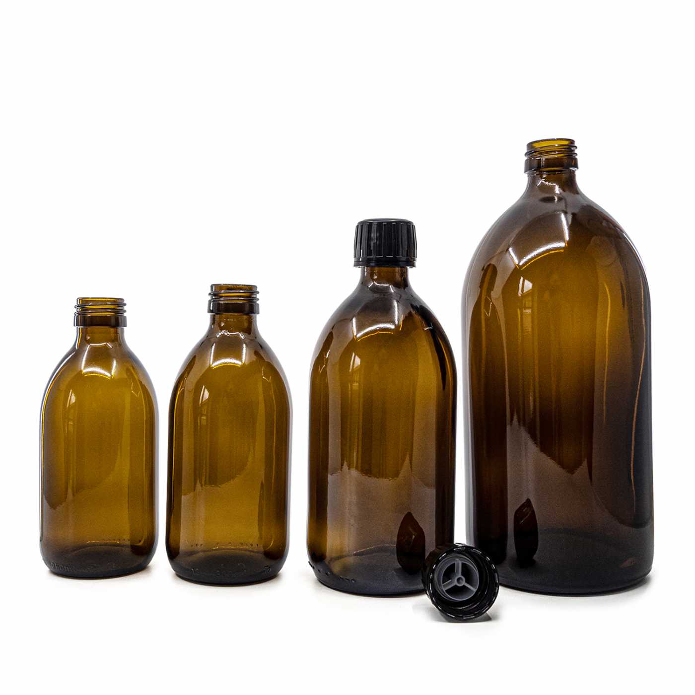 Bernsteinfarbene runde Sirup-Glasflasche, schwarzer Deckel und Ausgießer, 250 ml