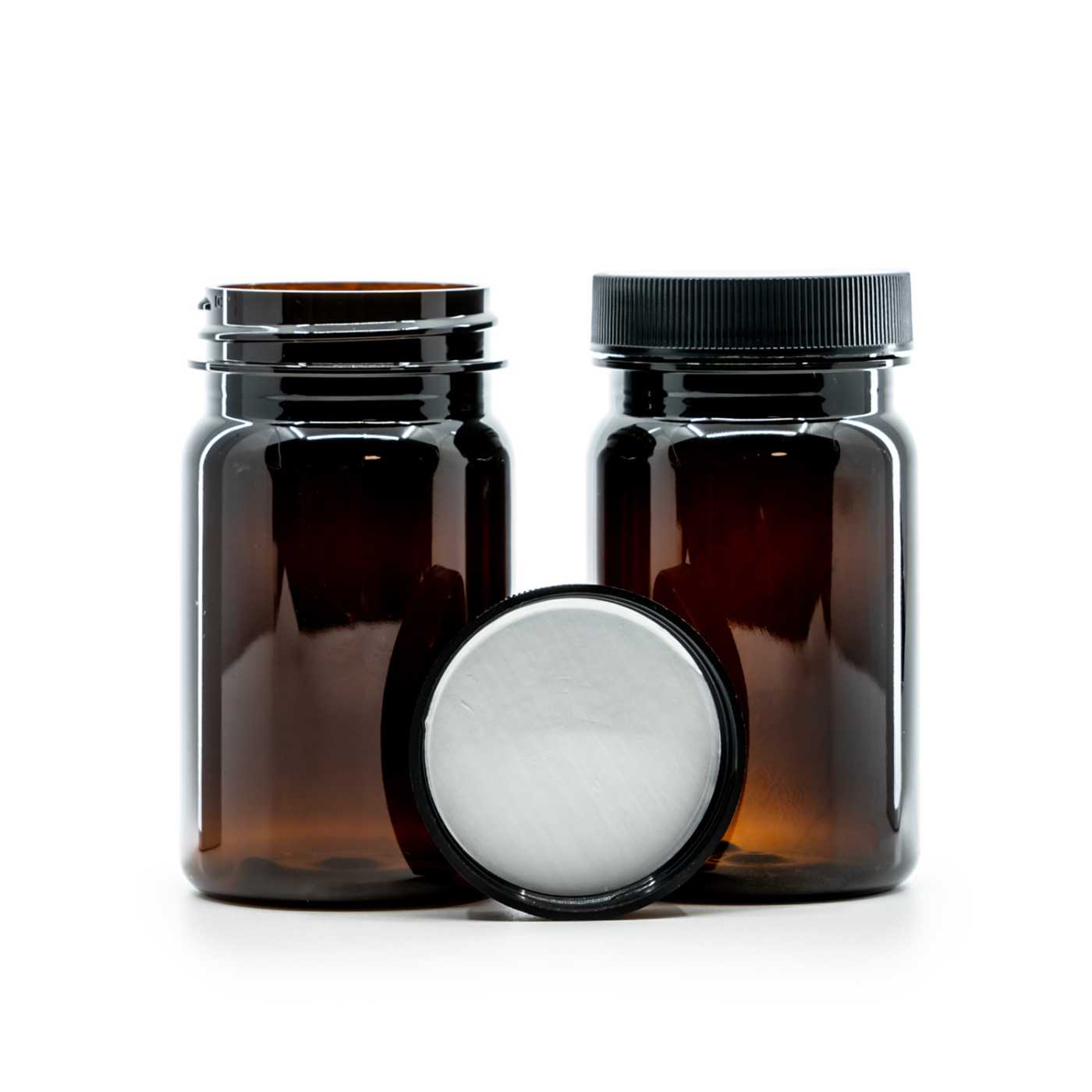 Bernsteinfarbenes Kunststoff-Pillenglas, schwarzer Deckel, induktionsgeeignet, 100 ml