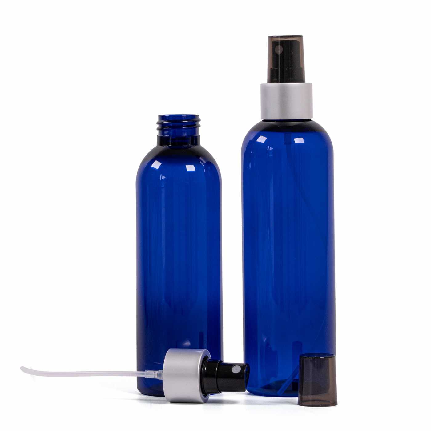Blaue Kunststoffflasche, schwarzer Sprühkopf, matt-silberner Kragen, rauchfarbener Überkappe, 250 ml