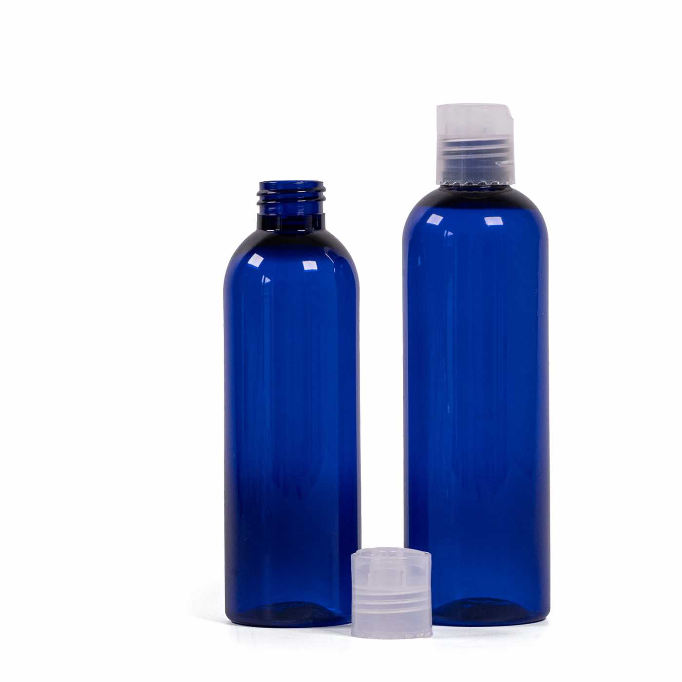 Blaue Kunststoffflasche aus PET mit glänzender Oberfläche.