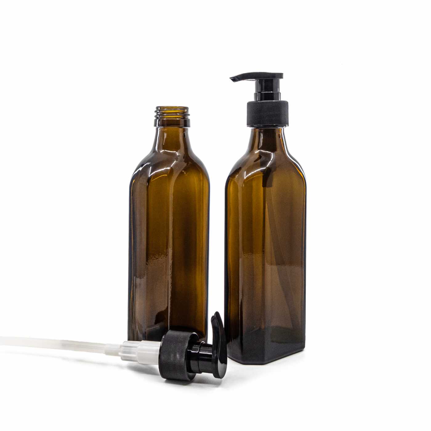 Braunglasflasche für Medikamente, rechteckig, PP28, schwarze gerippte Pumpe, 250 ml