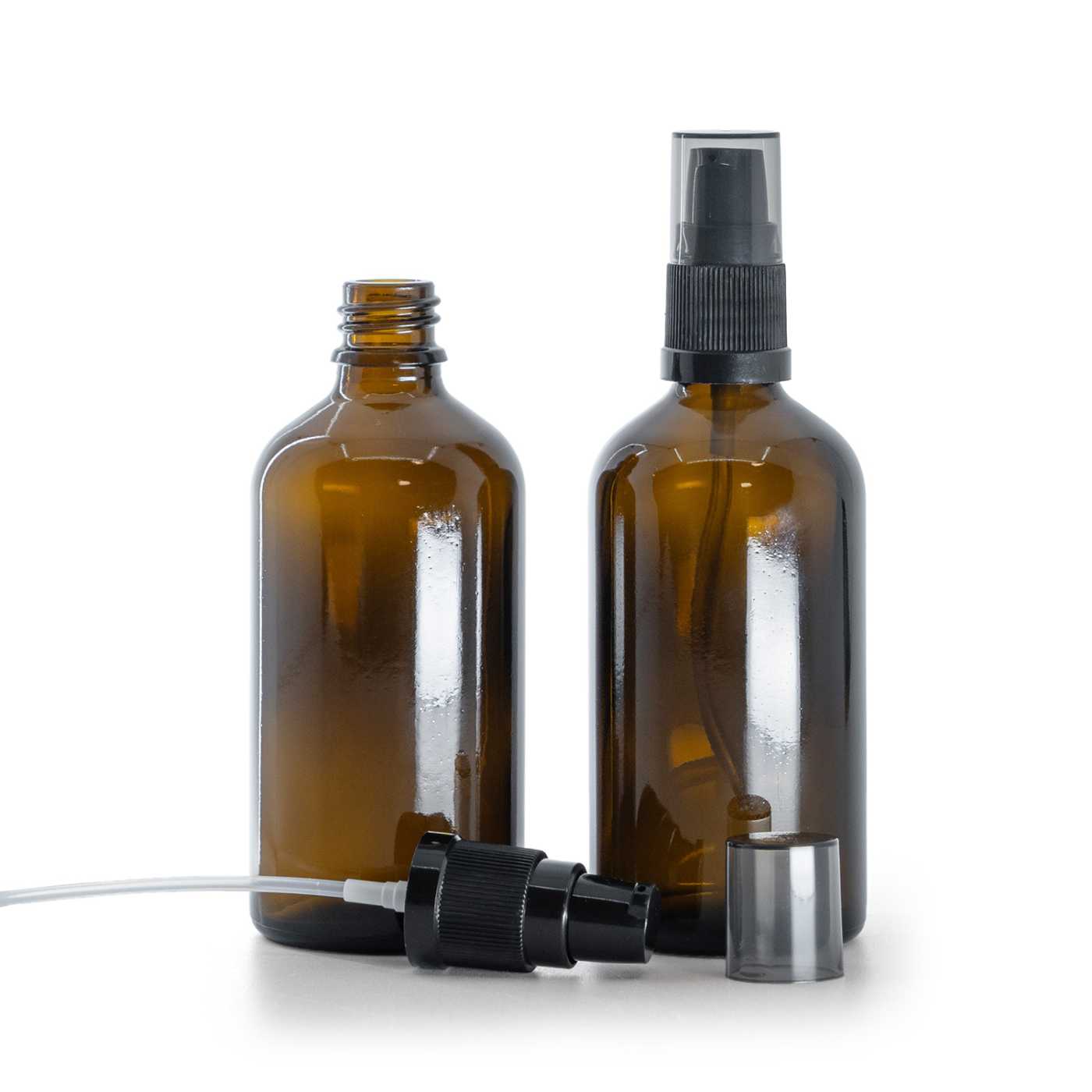 Braunglasflasche, schwarze Lotion-Pumpe mit rauchfarbener Kappe, 100 ml