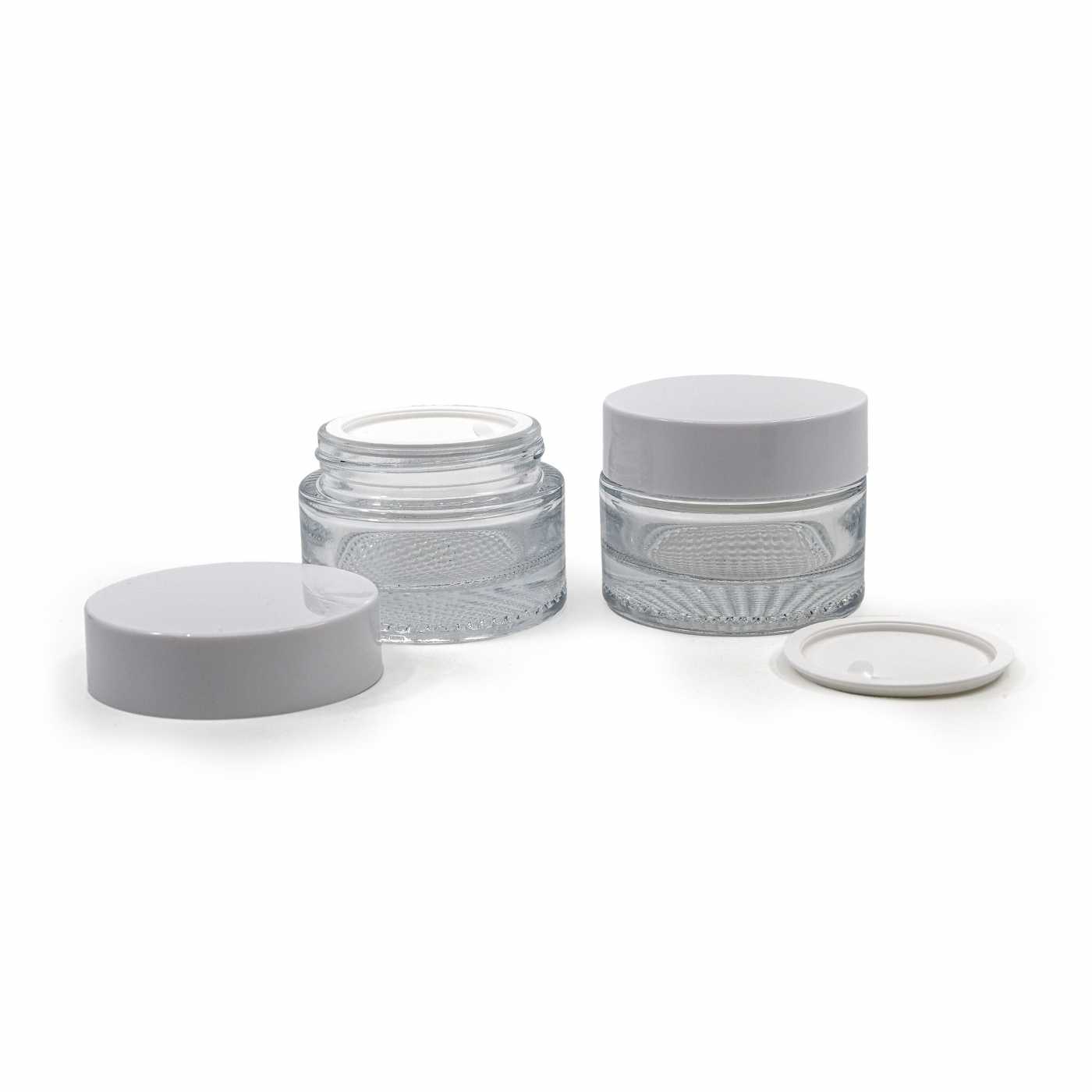 Dicker, klarer Kosmetikglasbehälter, weißer Kunststoffdeckel und Dichtung, 50 ml