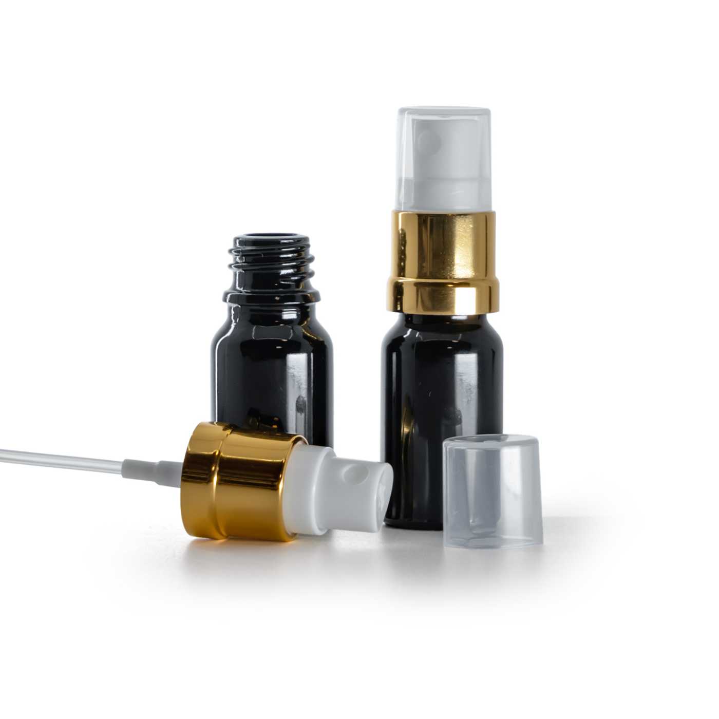 DieGlasflasche, schwarz glänzend, mit weiß-goldenem Zerstäuber ist eine professionelle Verpackung für flüssige Produkte in der Kosmetik und ausgewählten Lebensm... read more