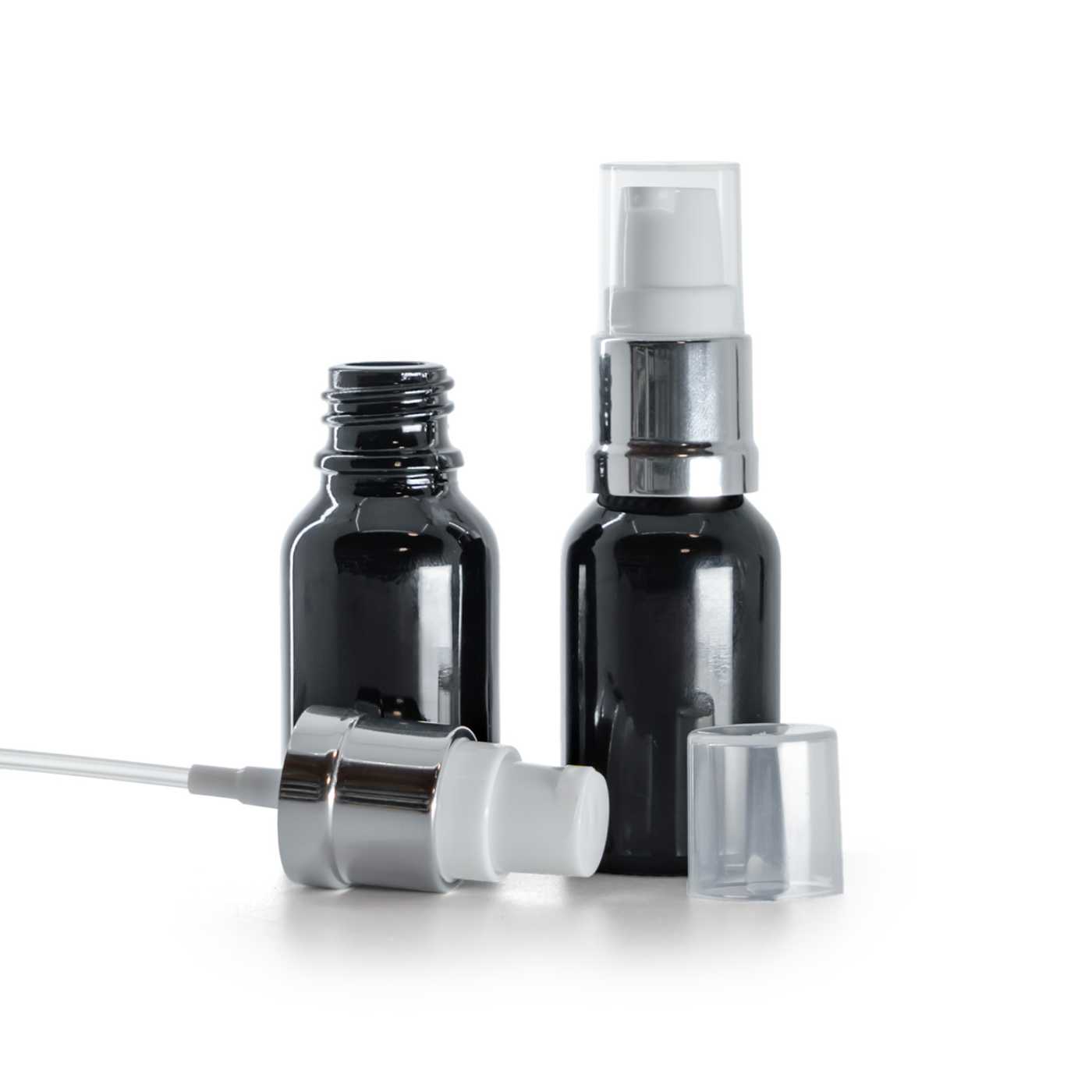Glänzend schwarze Glasflasche, glänzend silberweiße Pumpe, 15 ml