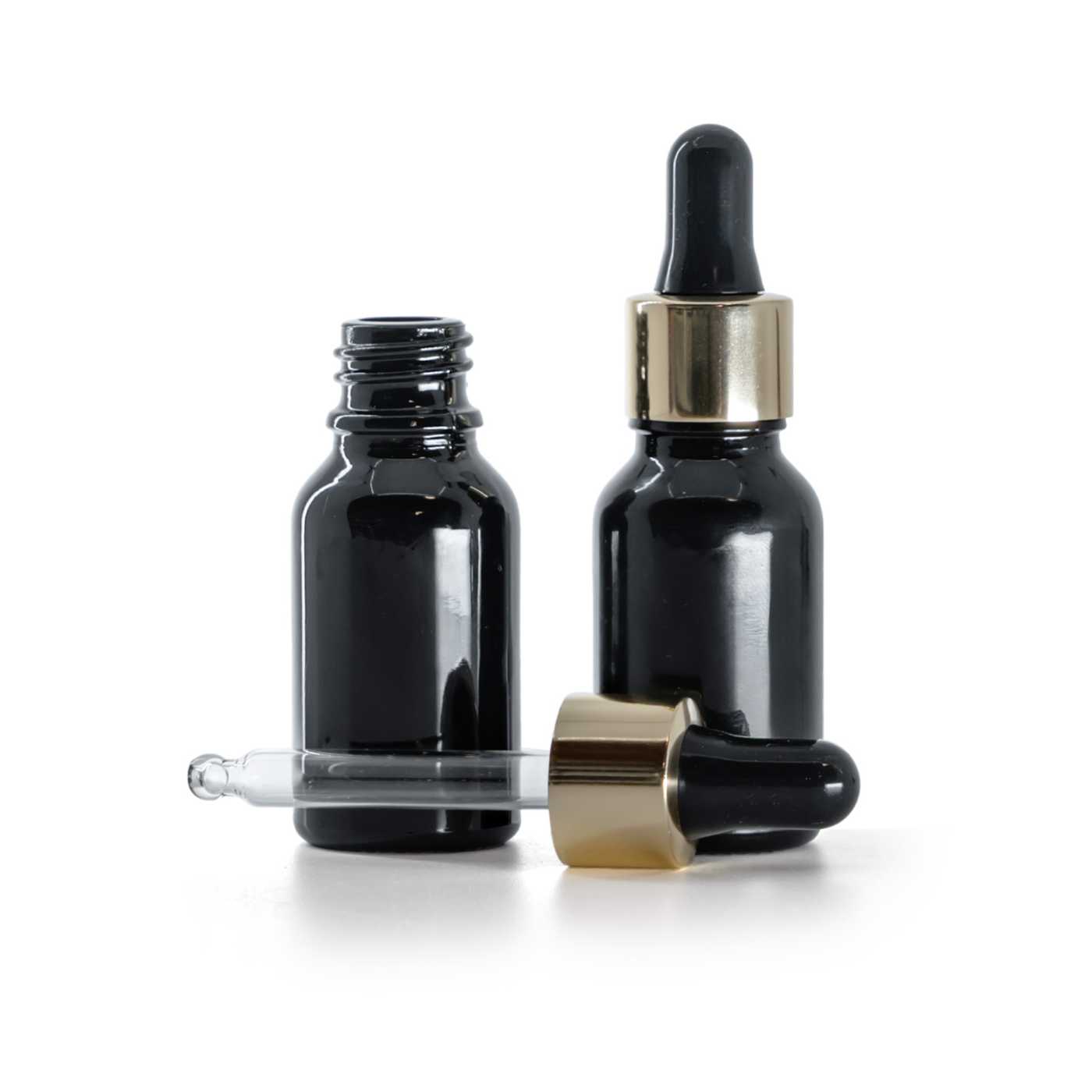 Glänzend schwarze Glasflasche, gold-schwarzer Tropfenzähler, 15 ml