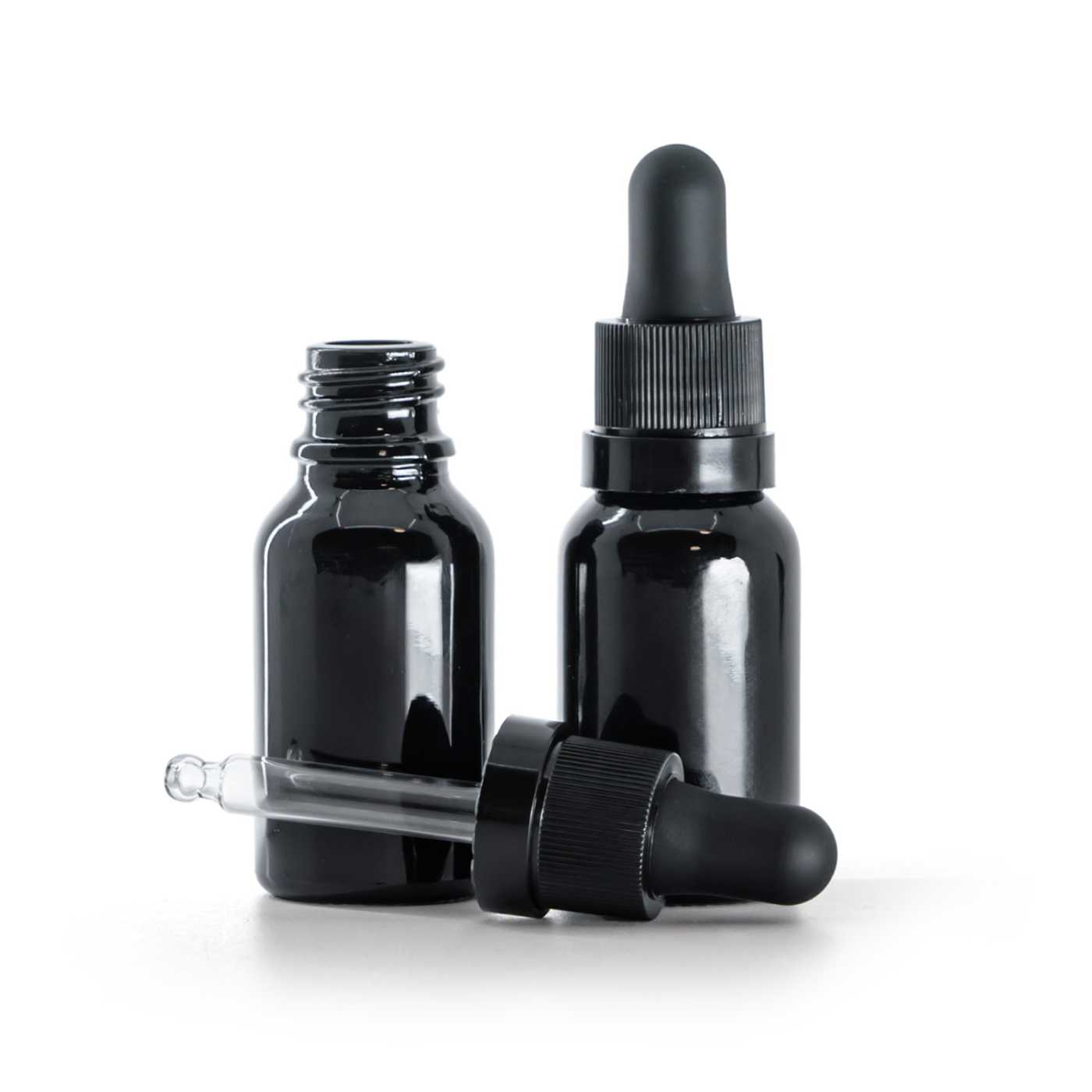Glänzend schwarze Glasflasche, mattschwarzer Tropfer mit glänzendem Streifen, 15 ml