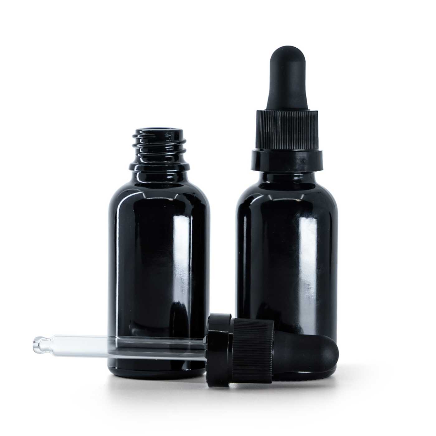 Glänzend schwarze Glasflasche, mattschwarzer Tropfer mit glänzendem Streifen, 30 ml