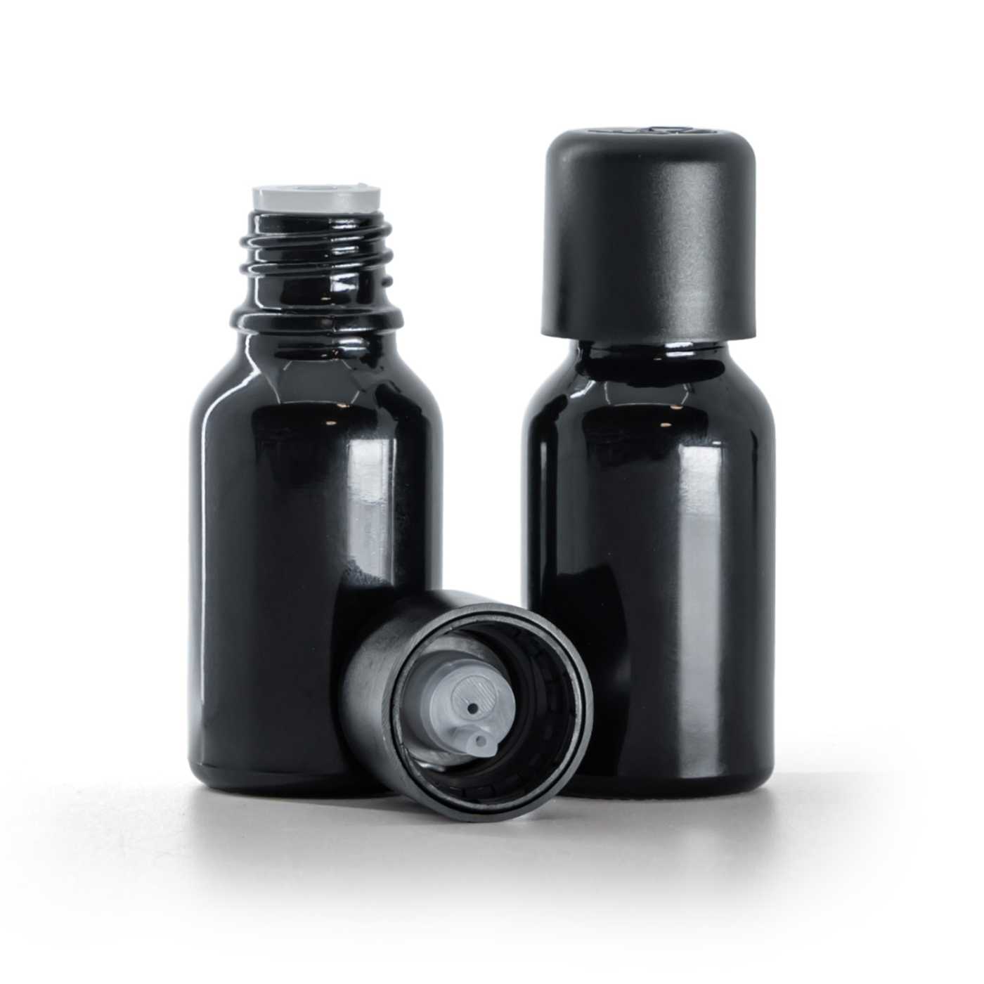 Glänzend schwarze Glasflasche, schwarze Sicherheitsverschlusskappe und Tropfer, 15 ml