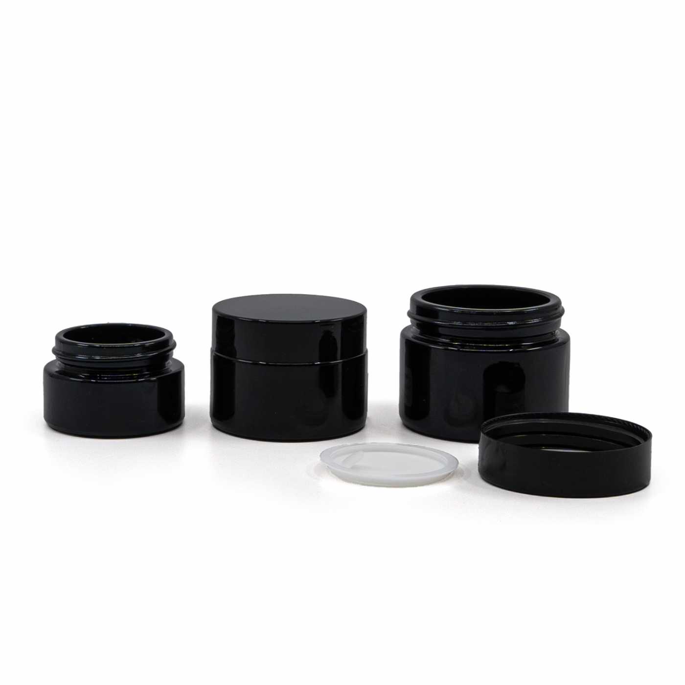 Eleganter, schwarz glänzender, dicker Glastiegel, geeignet für die Aufbewahrung von Cremes, Salben, Emulsionen oder Seren. Auch für die Herstellung von Kerzen geeignet.
