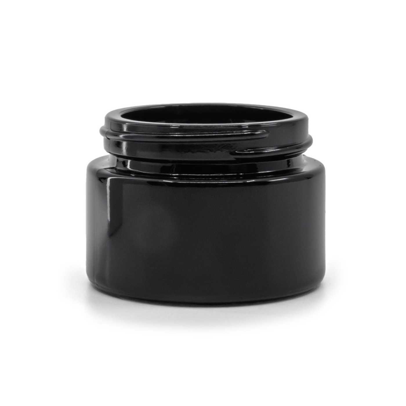 Eleganter, schwarz glänzender, dicker Glastiegel, geeignet für die Aufbewahrung von Cremes, Salben, Emulsionen oder Seren. Auch für die Herstellung von Kerzen geeignet.