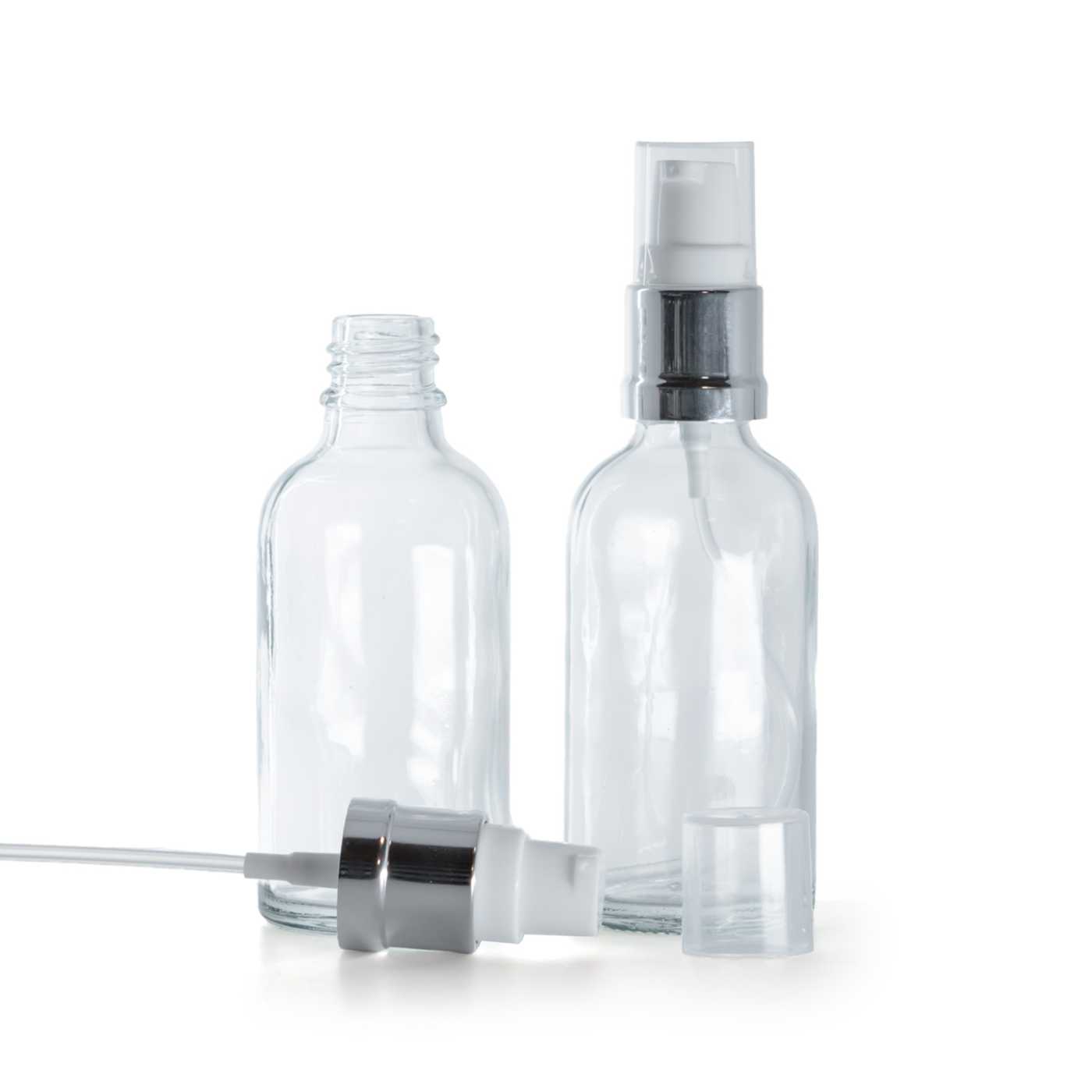 Glasflasche transparent mit glänzend weiß-silbernem Spender 50 ml