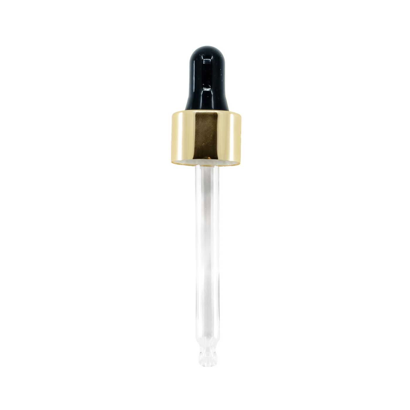 Glastropfer, schwarz/gold glänzende Kombination, passend für Flasche mit Halsdurchmesser 18 mm und Volumen 30 ml.Länge des Glasrohrs: 71 mmMaterial: Glas, Silikon, Aluminium, Kunststoff