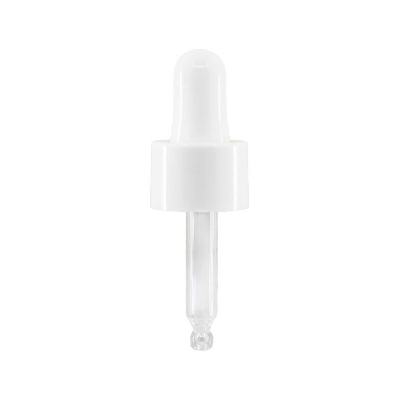 Glastropfer in weiß glänzender Farbe, geeignet für Flaschen mit einem Halsdurchmesser von 18 mm und einem Volumen von 10 ml.Länge der Pipette: 52 mmMaterial: Glas, Kunststoff