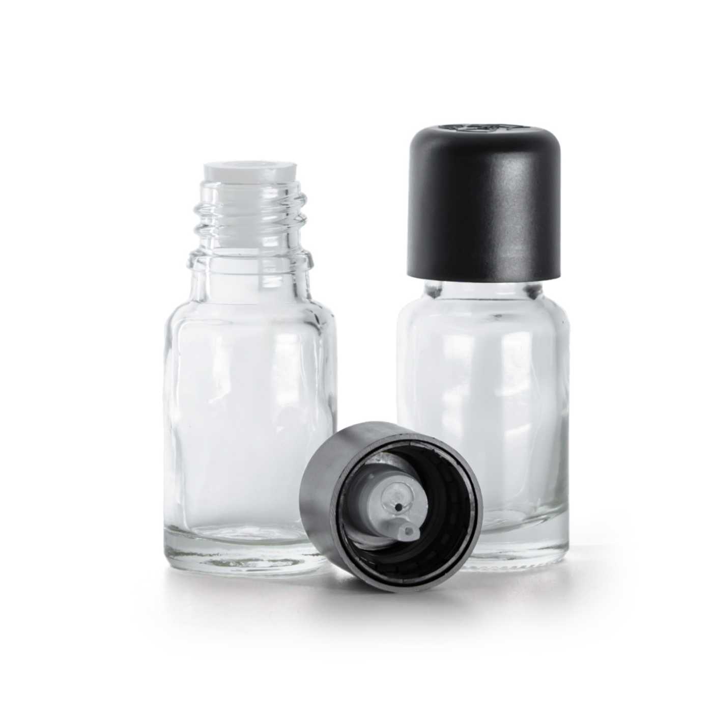 Klare Glasflasche, schwarzer Originalitätssicherheitsverschluss mit Tropfeinsatz, 10 ml