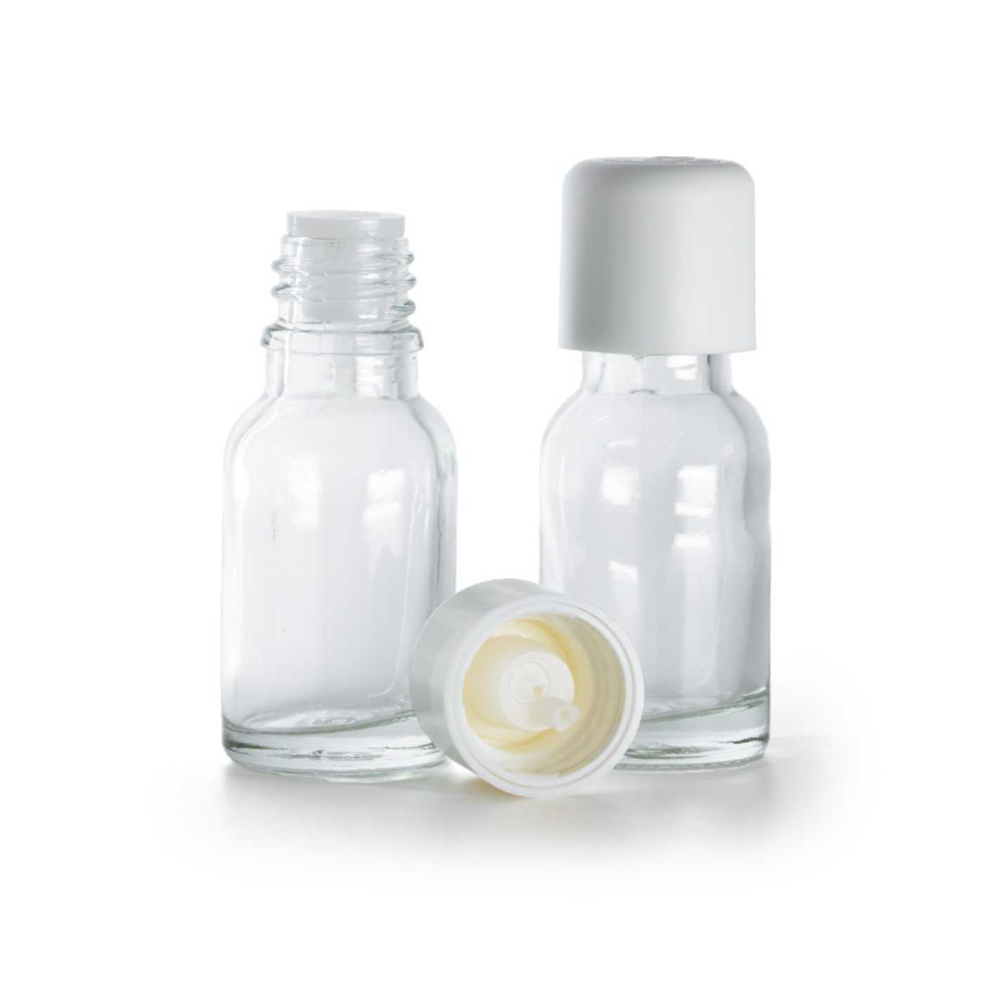 Klare Glasflasche, weißer Sicherheitsverschluss mit Tropfeinsatz, 15 ml