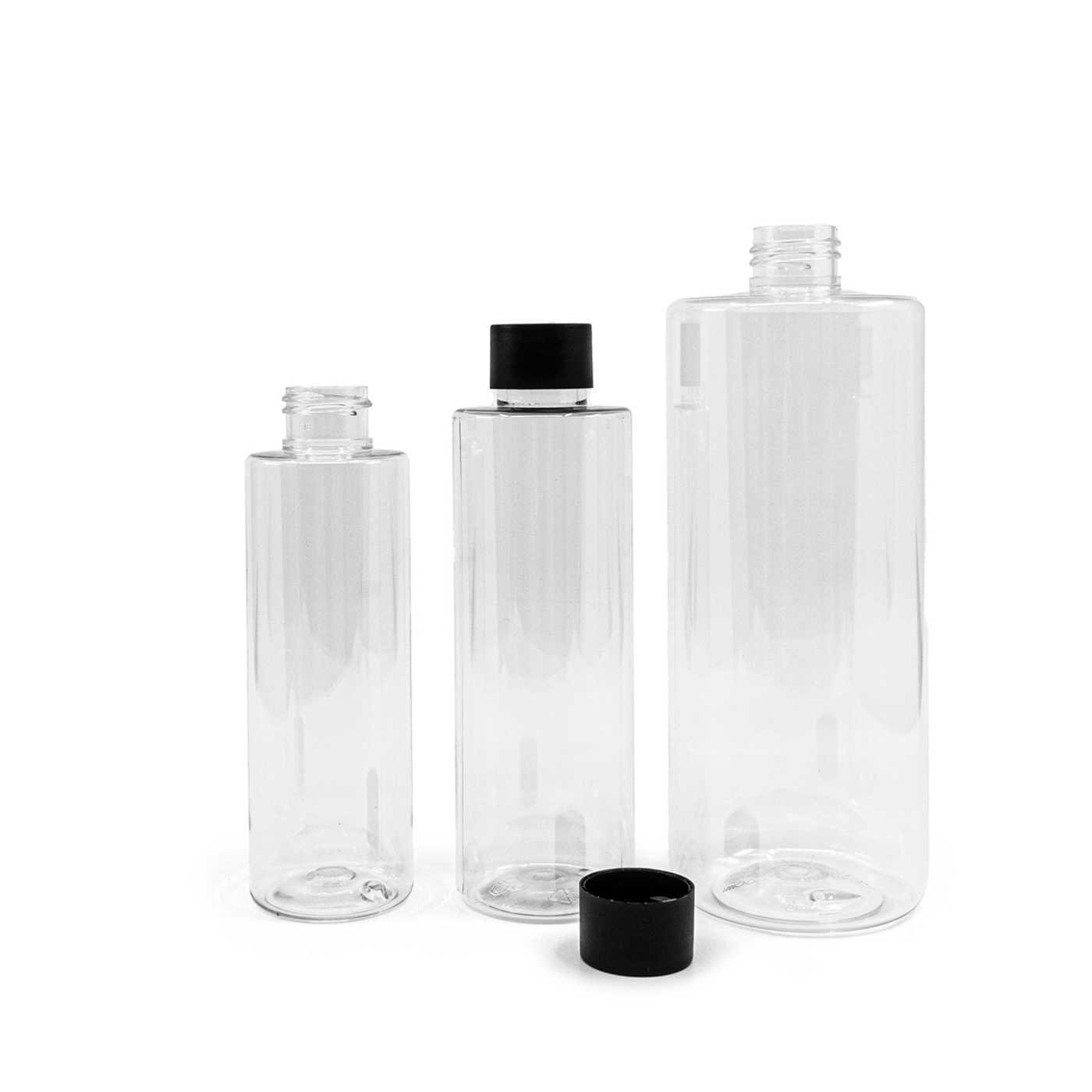 Transparente Kunststoffflasche, ideal für die Aufbewahrung einer Vielzahl von Flüssigkeiten, Ölen, Lotionen usw. Sie ist halbsteif, lässt sich aber zusammendrücken.