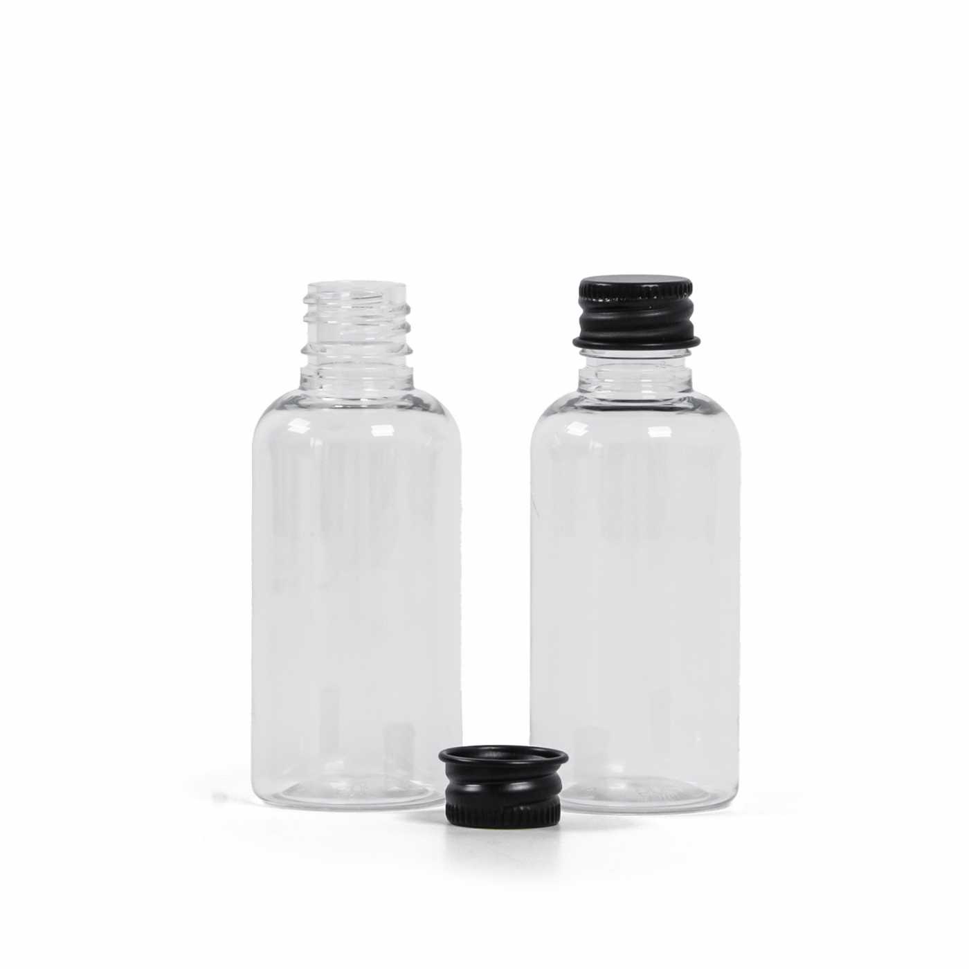 Klare Kunststoffflasche, schwarzer Aluminiumdeckel, 50 ml