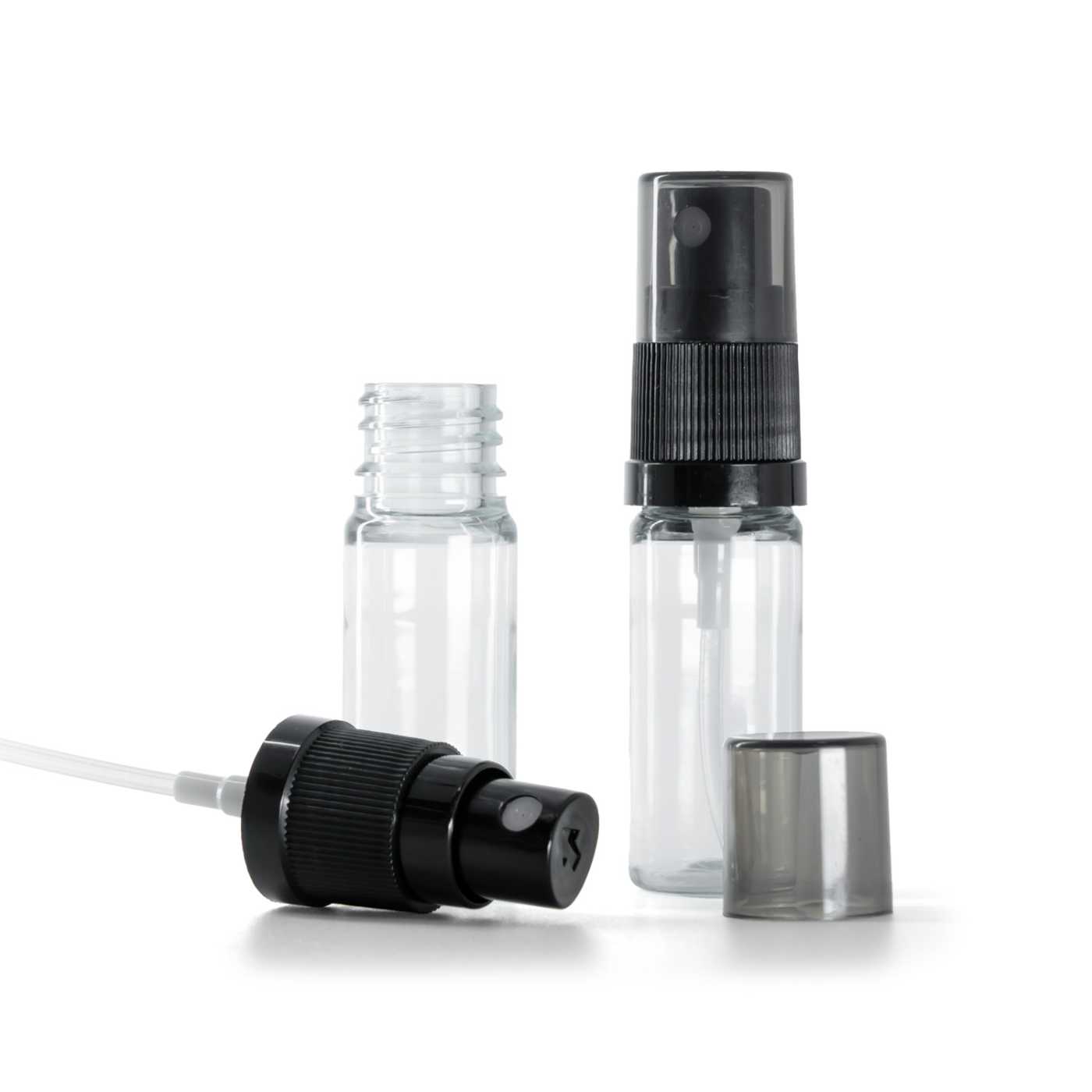 Klare Kunststoffflasche, schwarzer Feinnebelzerstäuber, rauchfarbener Überkappe, 10 ml