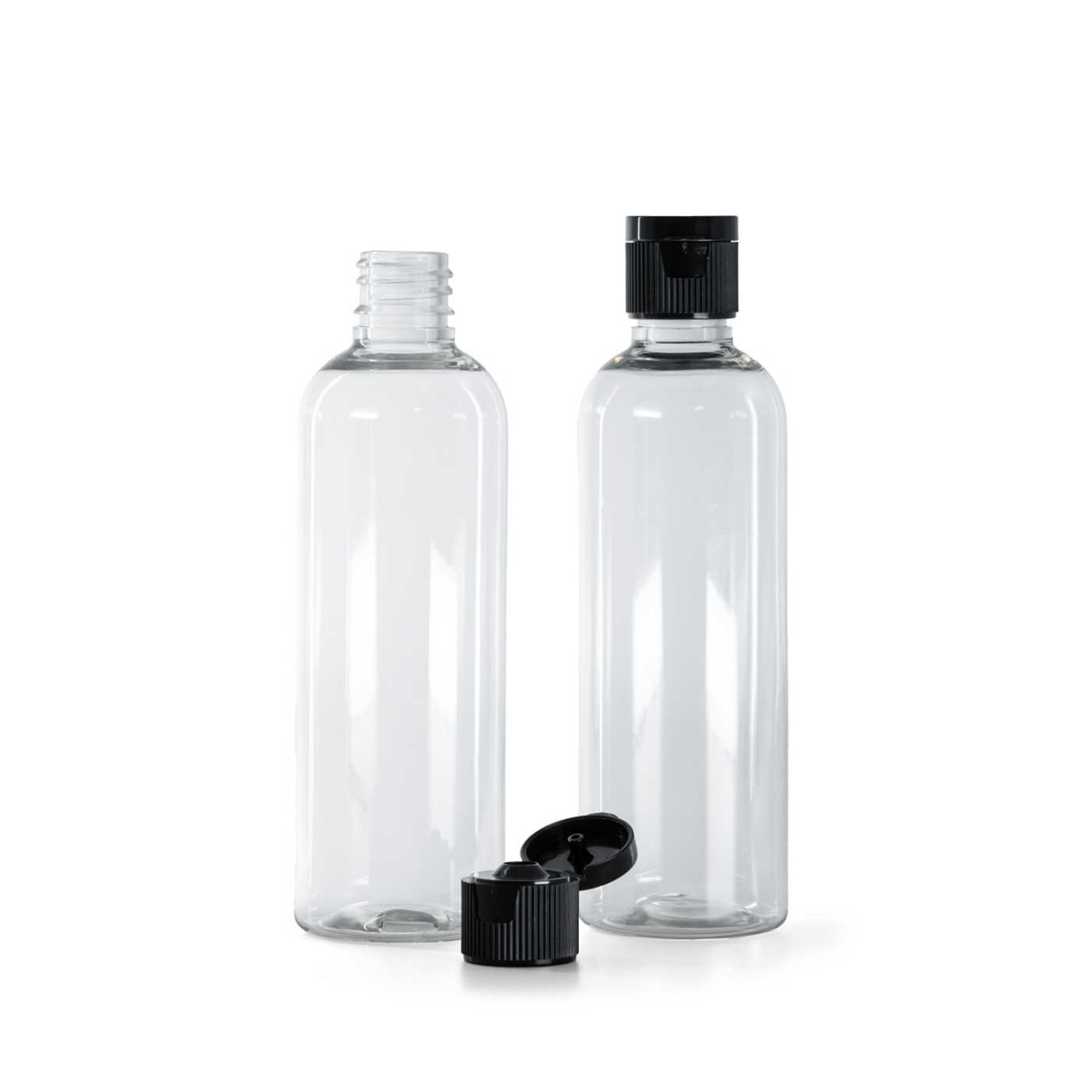 Klare Kunststoffflasche, schwarzer Kunststoff-Flip-Top-Verschluss, 18/410, 100 ml