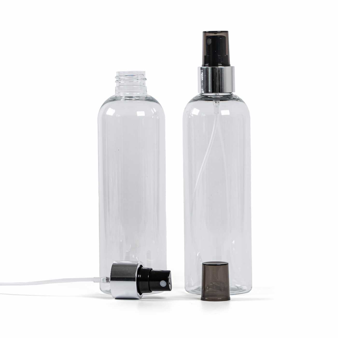 Schwarzer Plastikzerstäuber mit transparenter Kappe und silbern glänzendem Hals mit einem Durchmesser von 24 mm.