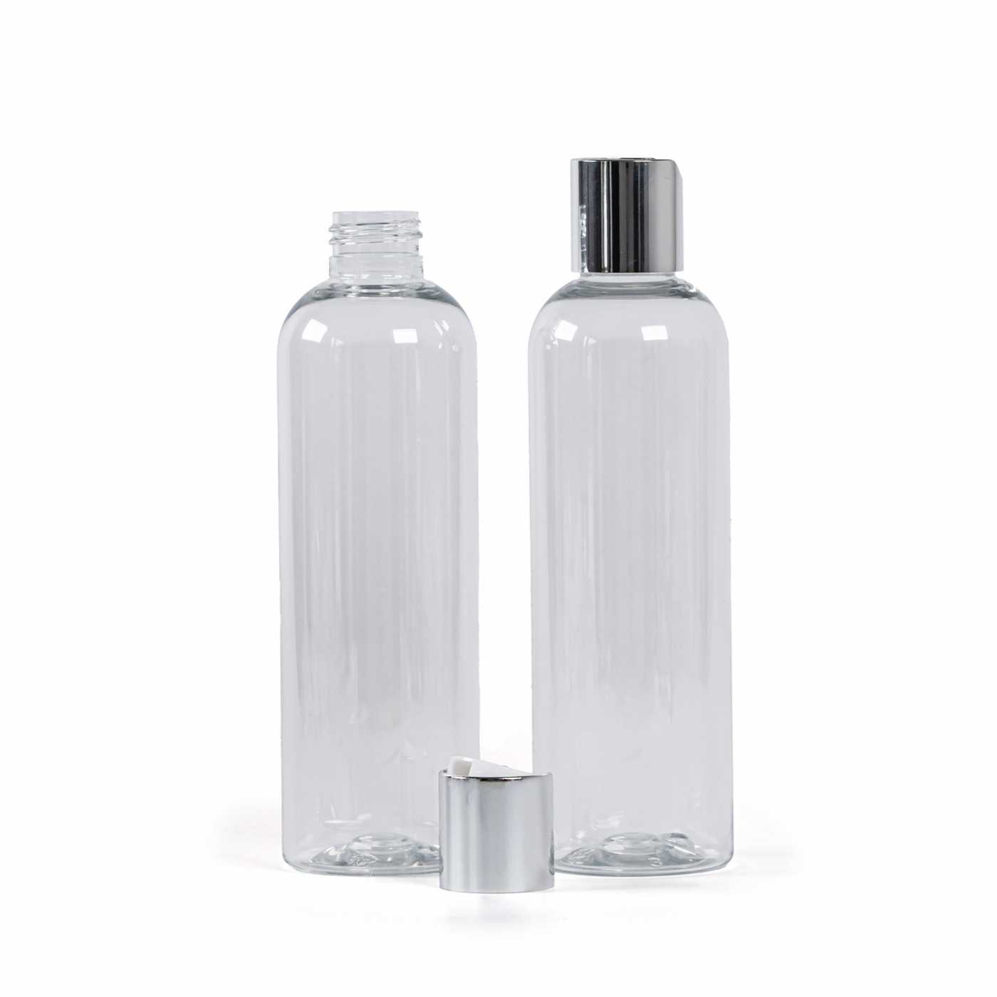 Transparente Kunststoffflasche, ideal für die Aufbewahrung einer Vielzahl von Flüssigkeiten, Ölen, Lotionen usw. Sie ist halbsteif, lässt sich aber zusammendrücken.