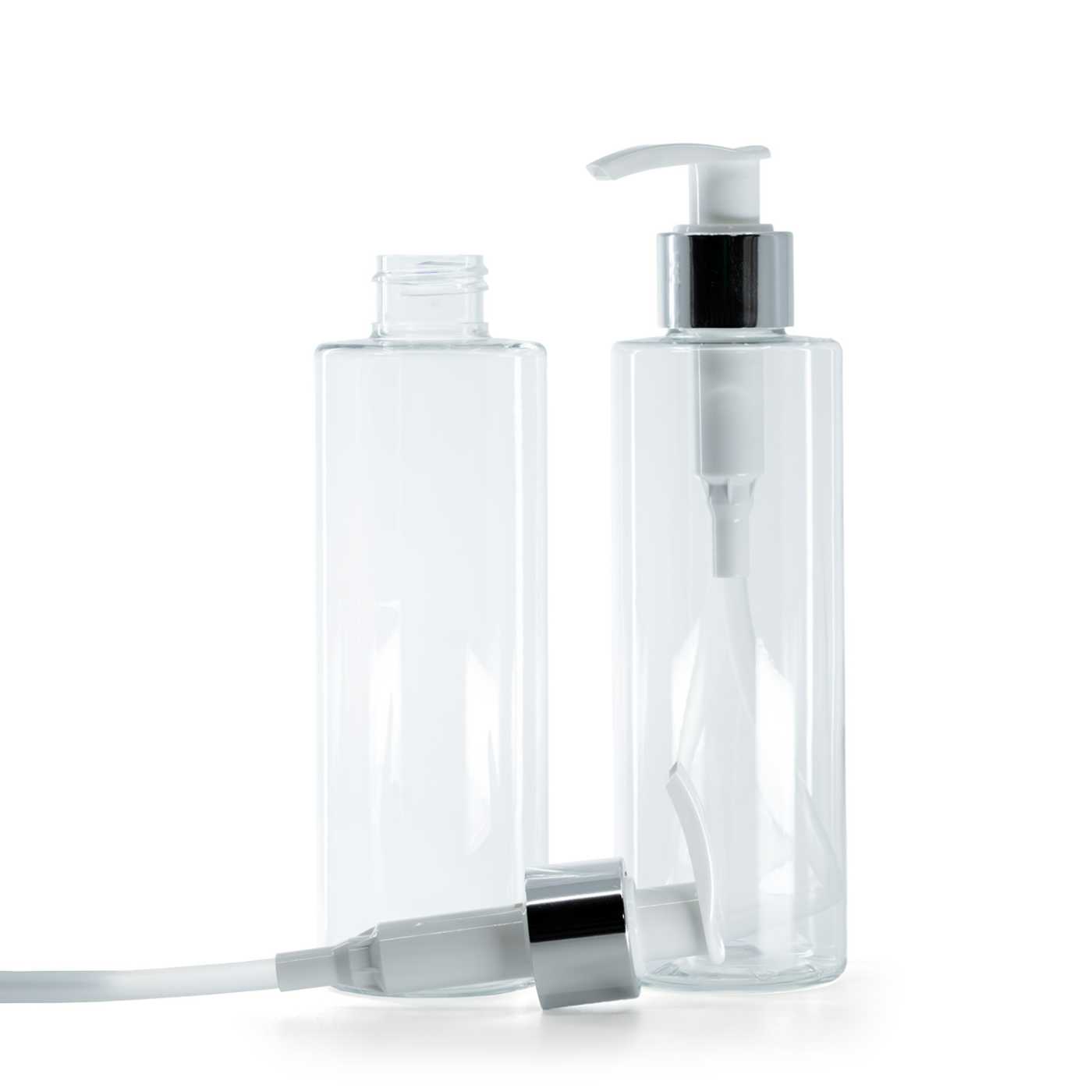 Transparente Kunststoffflasche, ideal für die Aufbewahrung einer Vielzahl von Flüssigkeiten, Ölen, Lotionen usw. Sie ist halbsteif, lässt sich aber zusammendrücken.