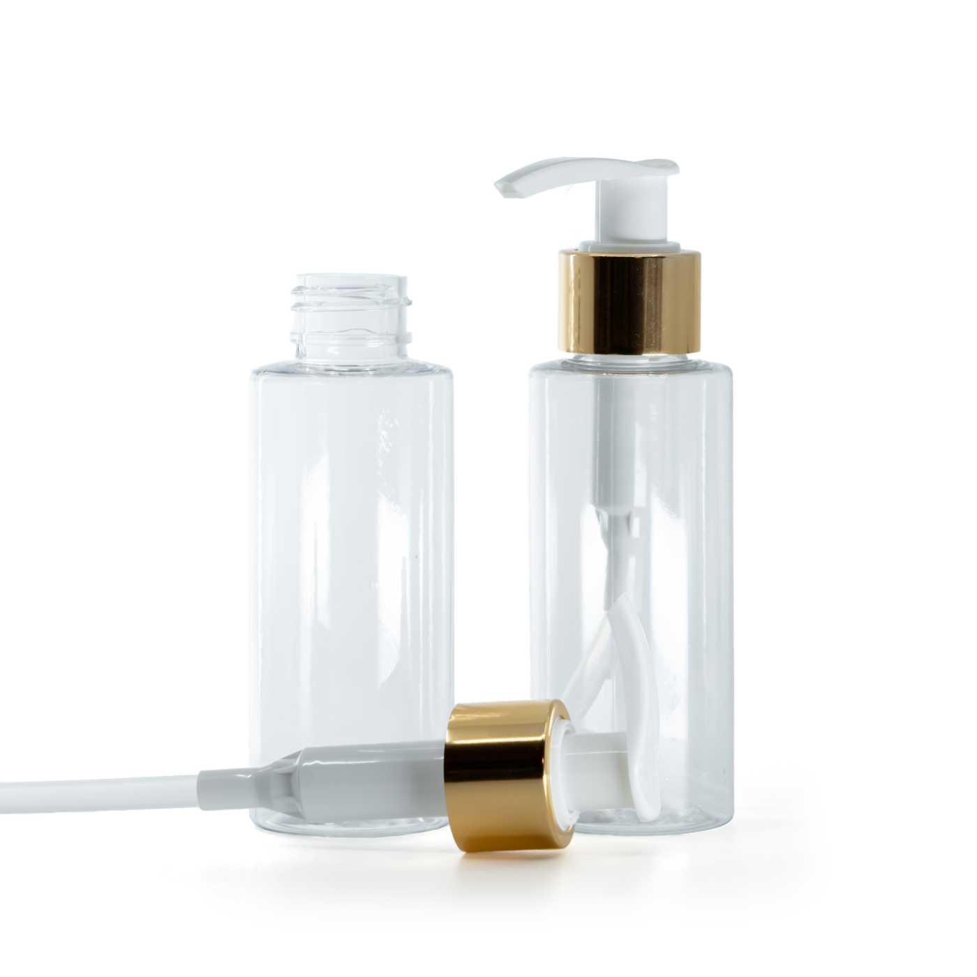 Klare Kunststoffflasche, weiße Lotionpumpe mit glänzendem Goldkragen, 100 ml