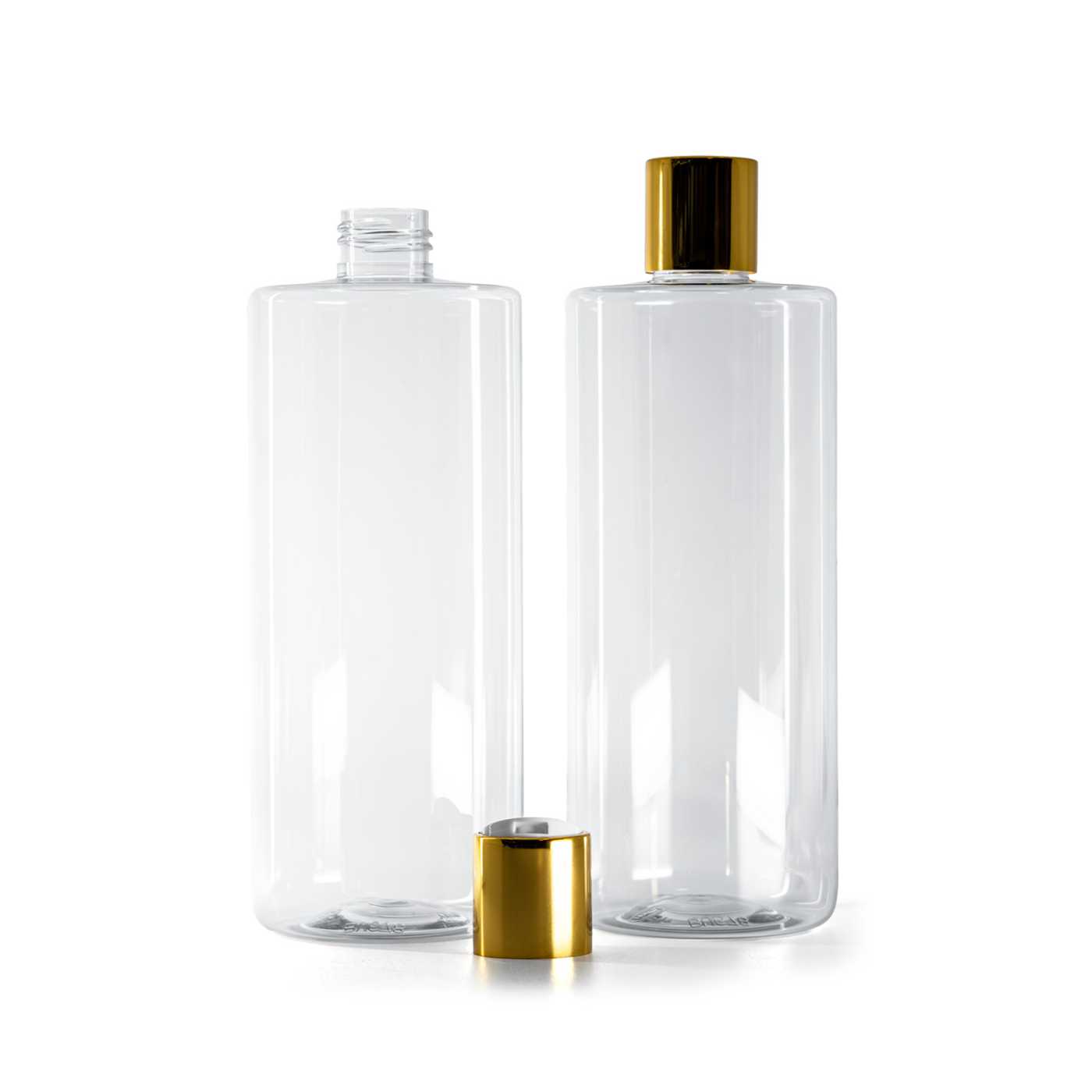 Klare Kunststoffflasche, weißer Kunststoff-Kippverschluss mit goldenem Aluminiumkragen, 500 ml