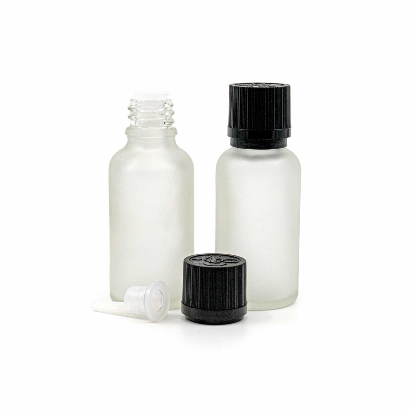 Klare Milchglasflasche, schwarze Sicherheitskappe und Tropfer 30 ml