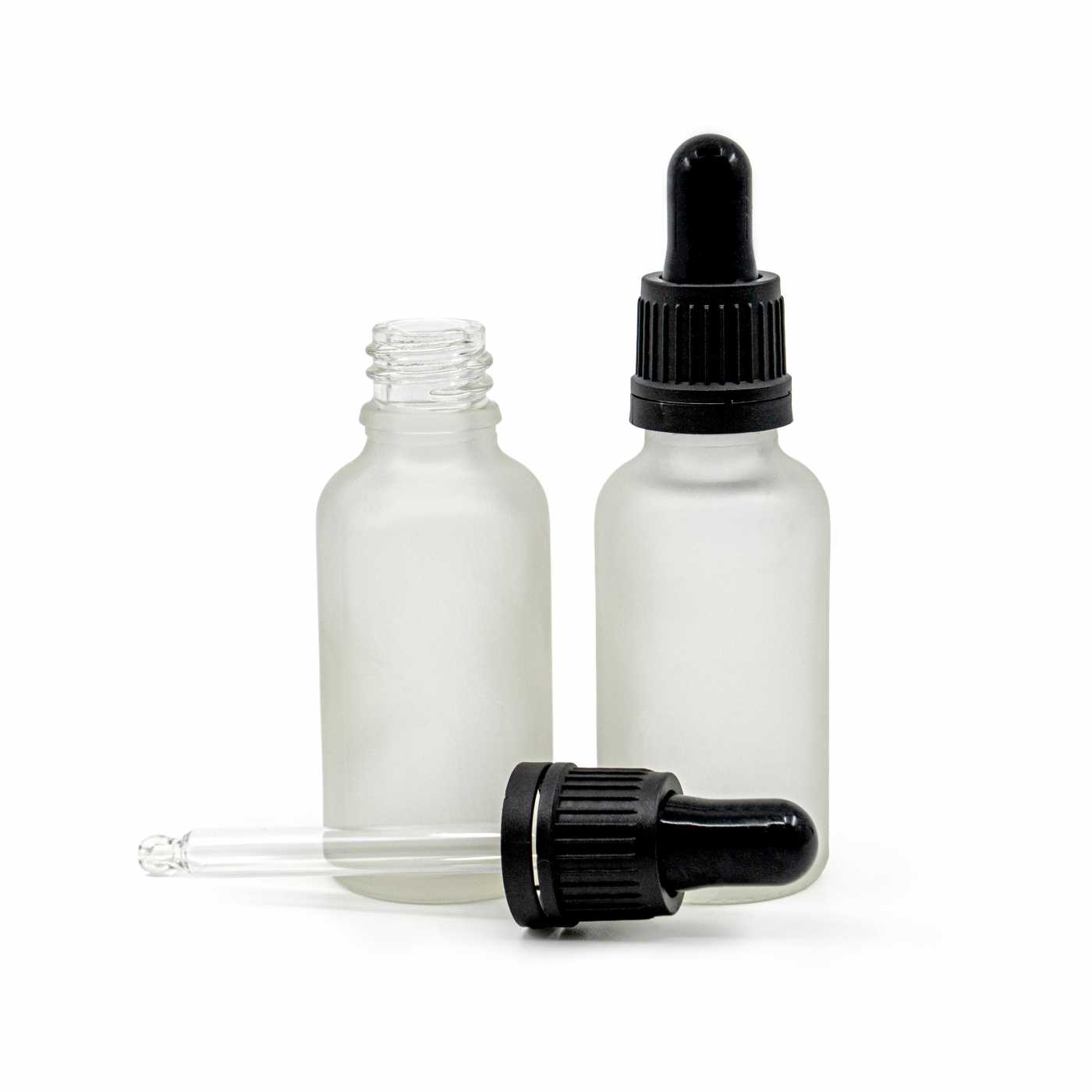 Schwarzer Kunststofftropfer mit Sicherheitsring, passend für Flasche mit Halsdurchmesser 18 mm und Volumen 30 ml.Länge des Glasröhrchens: 73 mmMaterial: Glas, Kunststoff