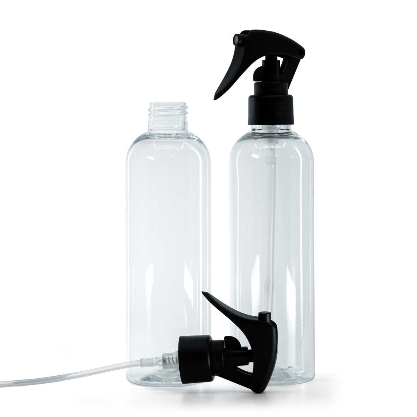 Klarglas Kunststoffflasche, Mini-Trigger-Sprühkopf matt Schwarz, glatter Halsring, 250 ml