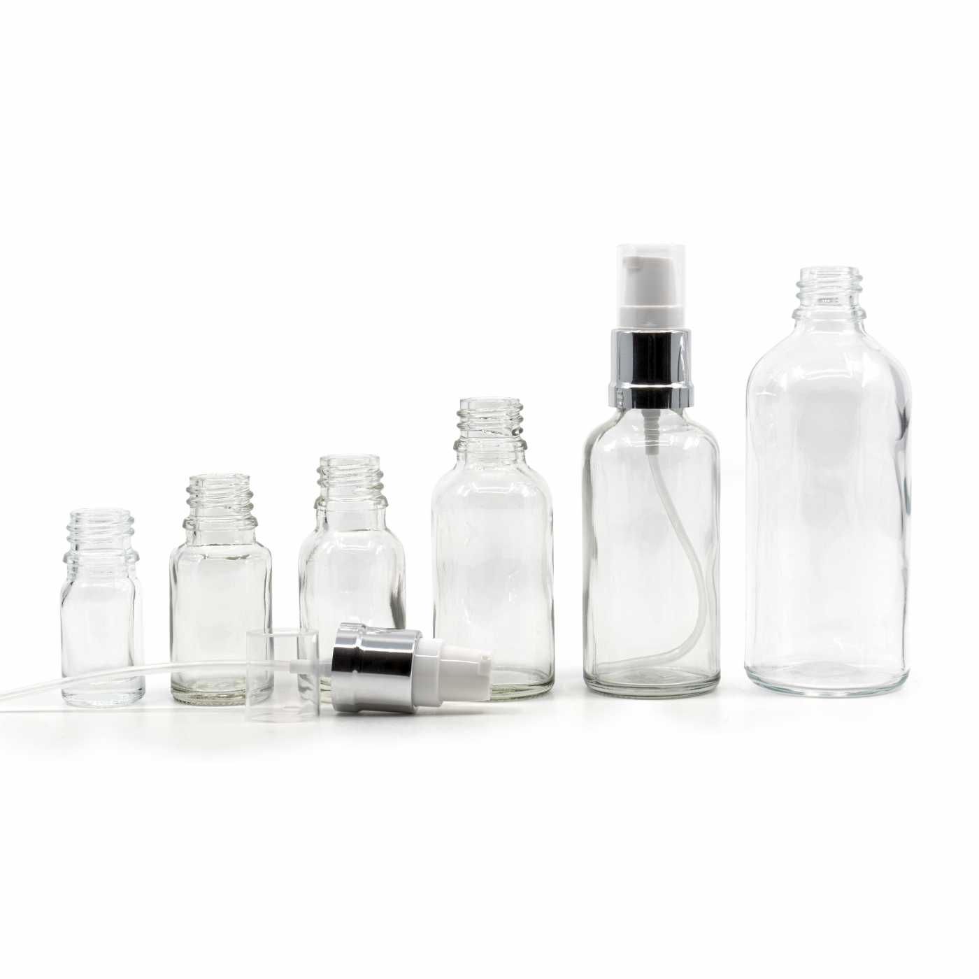 Klarglasflasche, glänzende silberweiße Pumpe, 30 ml