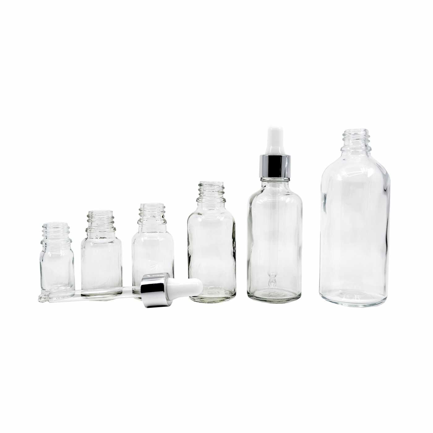 Glastropfer, weiß/silber glänzend, passend für Flasche mit Halsdurchmesser 18 mm und Volumen 100 ml.Länge des Glasrohrs: 103 mmMaterial: Glas, Silikon, Aluminium, Kunststoff