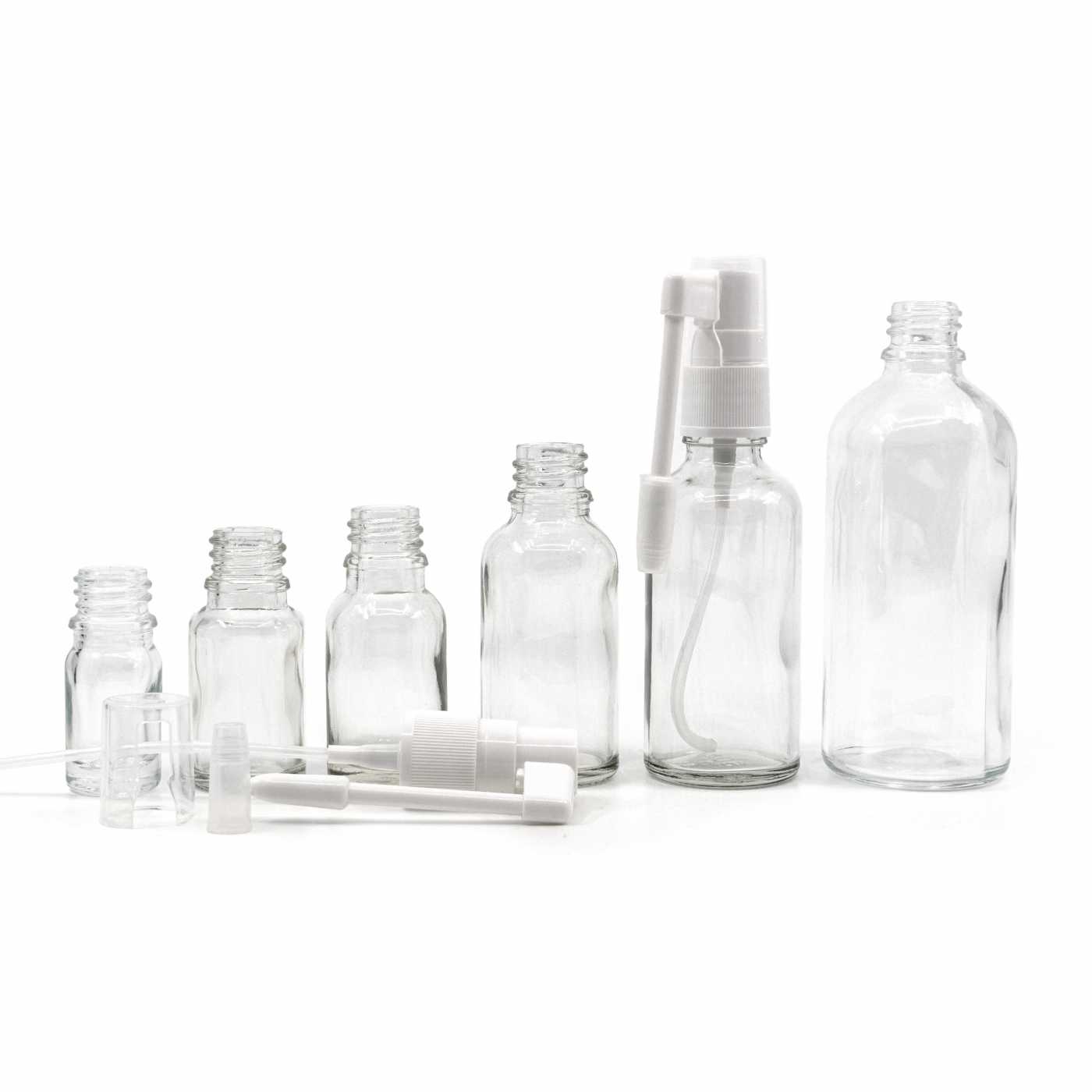 Halsflüssigkeitsapplikator aus Kunststoff in weißer Farbe. Der Mundspray ist für die Kombination mit allen Glasflaschen mit 18 mm Hals geeignet.