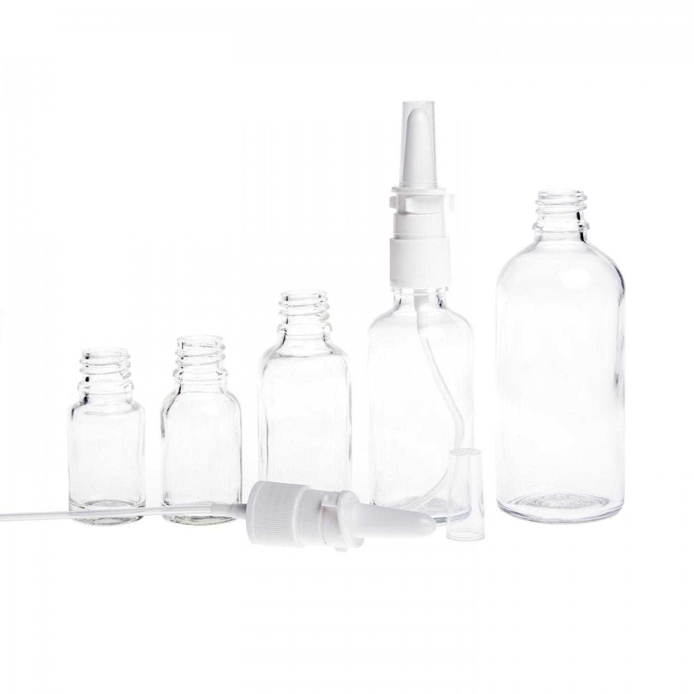 Nasenspray-Applikator aus weißem Kunststoff. Das Nasenspray ist für die Kombination mit allen Glasflaschen mit einem Hals von 18 mm geeignet.