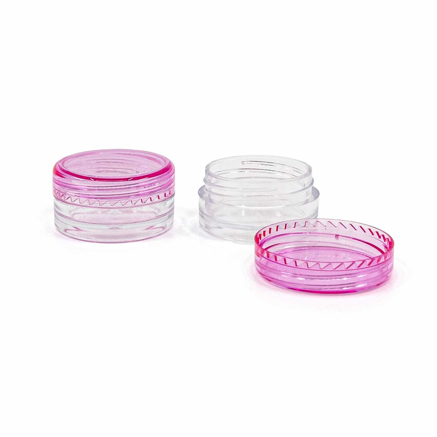 Transparenter 5-ml-Kunststoffbecher mit aufschraubbarem, geschmackvollem rosa Deckel.Geeignet für spezielle Seren.Abmessungen: 2,9x1,6 cmDie Verpackung ist für die Verwendung in Kosmetika zertifiziert.