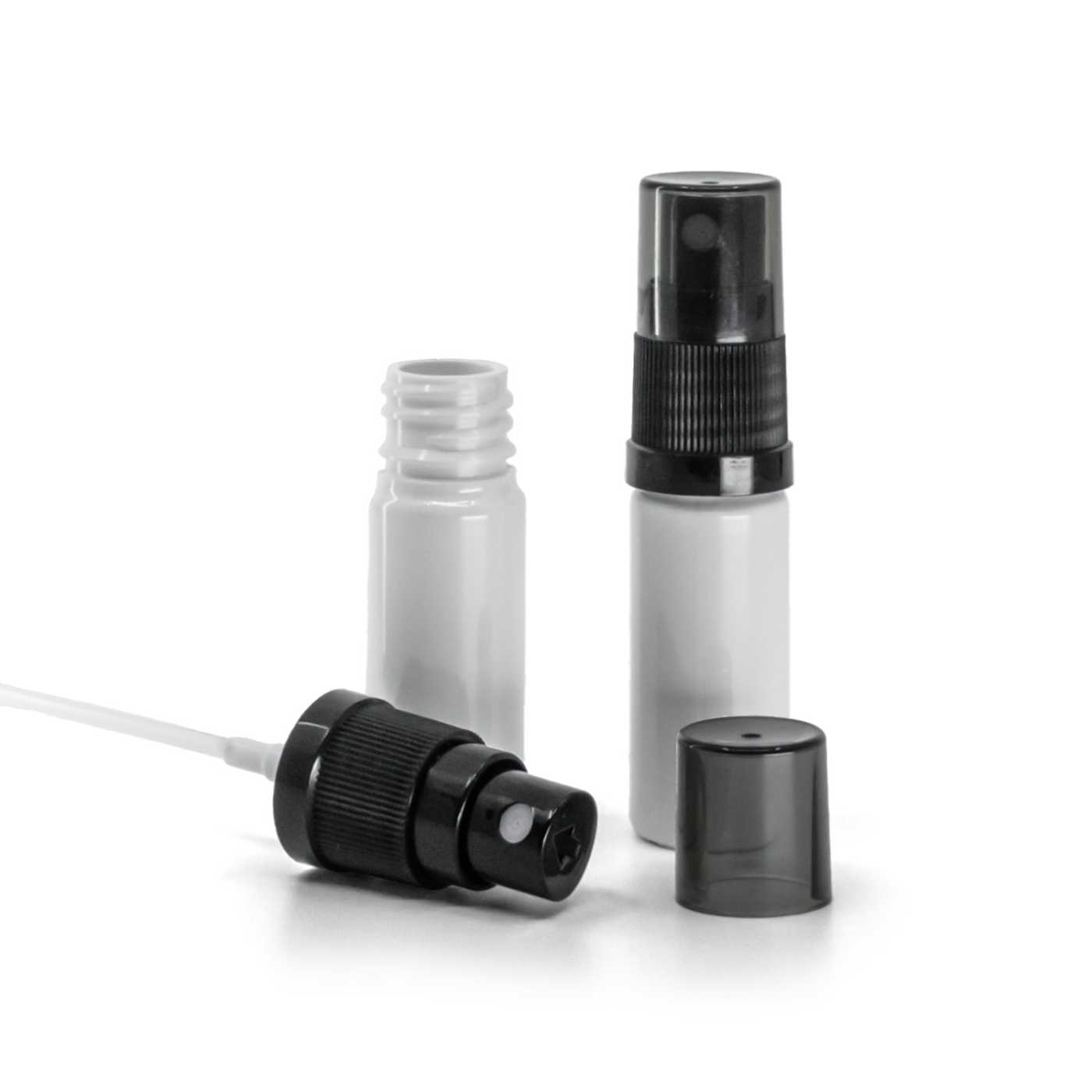 Kunststoffflasche weiß, schwarzer Feinnebelzerstäuber, Smoky-Überkappe, 10 ml