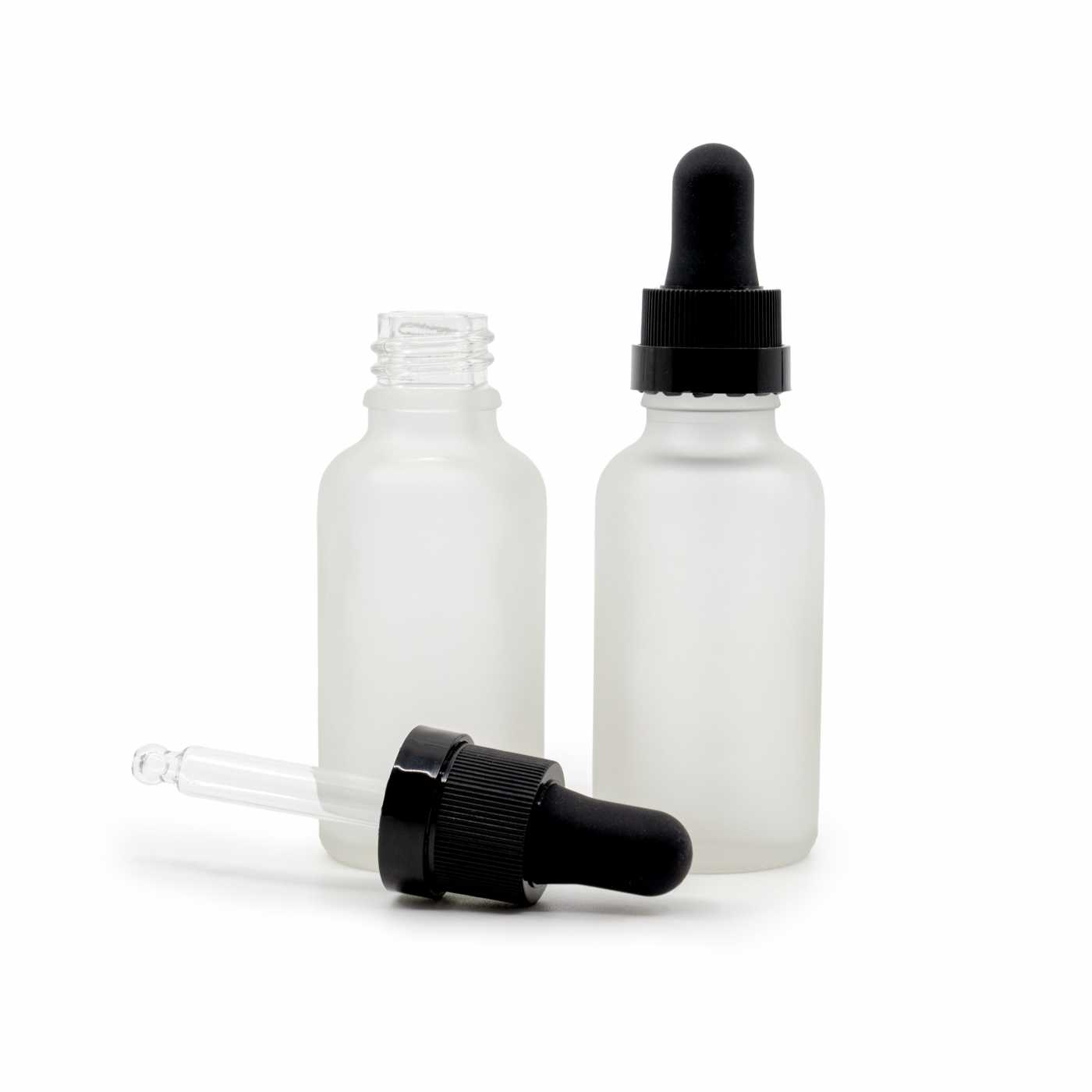 Mattierte Klarglasflasche, schwarzer Pipettenverschluss mit glänzendem Ring, 30 ml