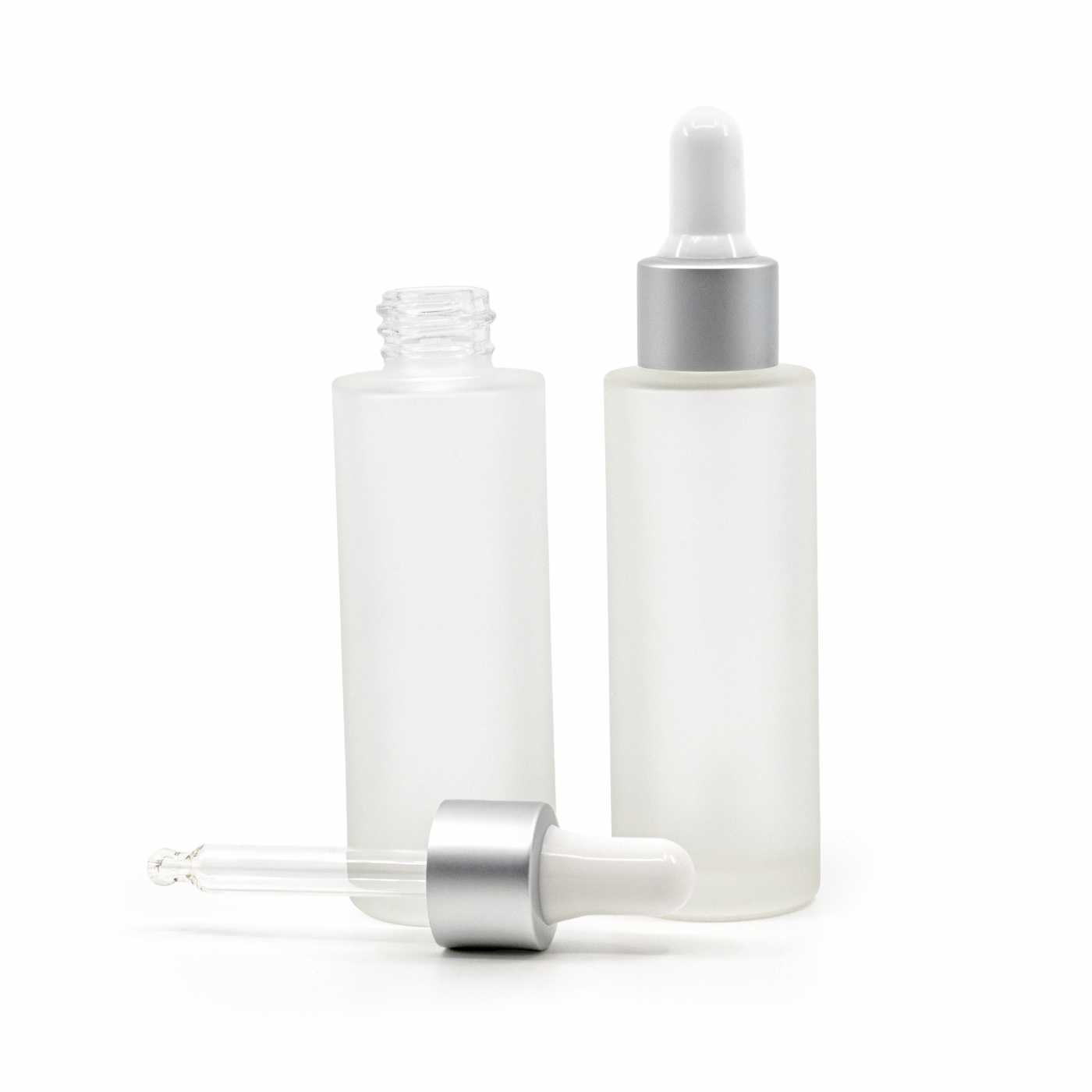 Glastropfer in Kombination weiß/silber matt, passend für Flasche mit Halsdurchmesser 18 mm und Volumen 50 ml.Länge des Glasrohrs: 84 mmMaterial: Glas, Silikon, Aluminium, Kunststoff