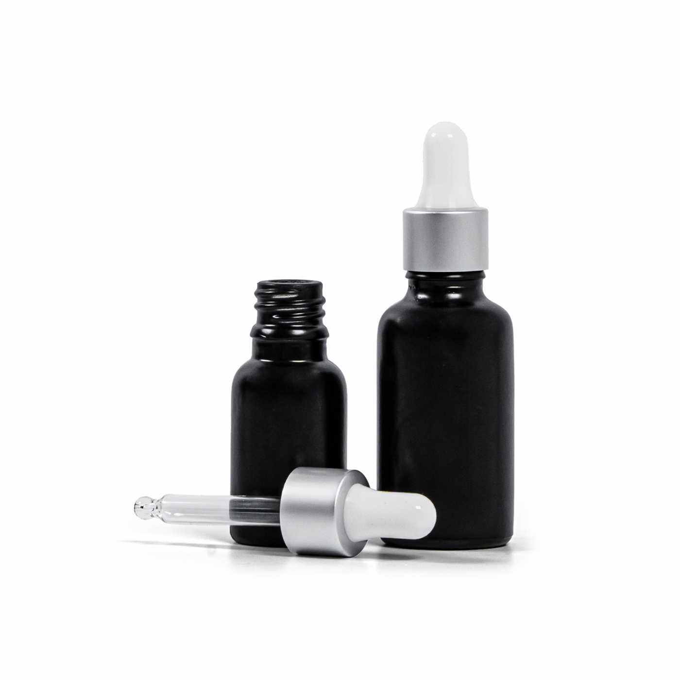 Mattschwarze Glasflasche, mattsilberne Pipette, 30 ml