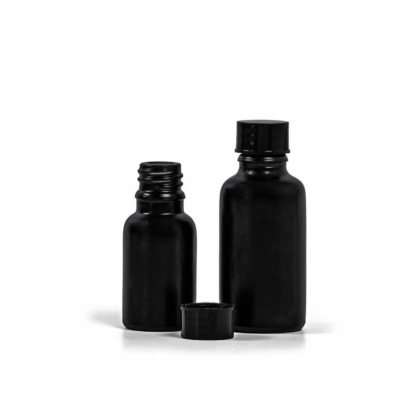 Schwarzer Kunststoffverschluss, geeignet für Flaschen mit einem Halsdurchmesser von 18 mm (Volumen 5 - 100 ml). Es handelt sich um einen einfachen Verschluss ohne Sicherheitsring oder internen Kunststofftropfer.