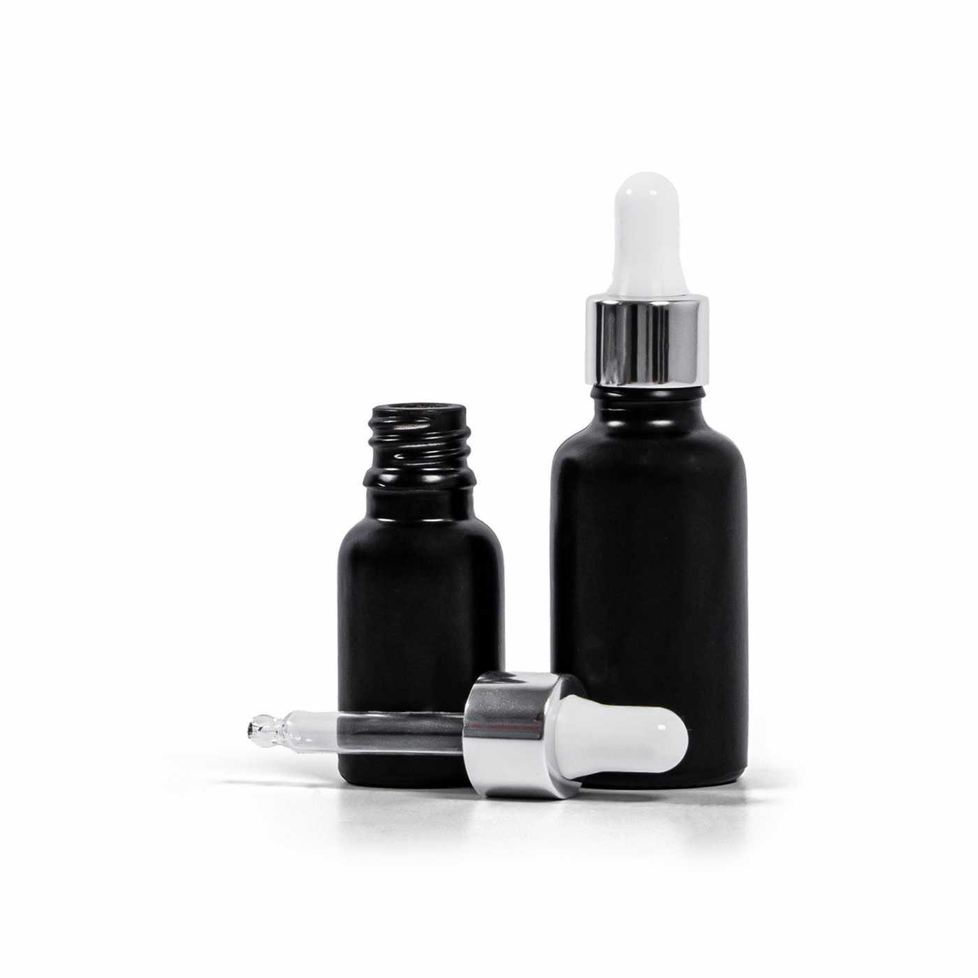 Die Glasflasche, das sogenannte Fläschchen, ist aus dickem Glas in schwarzer, matter Ausführung gefertigt. Sie dient zur Aufbewahrung von Flüssigkeiten, die sie dank ihrer Farbe effektiv vor Licht schützt.