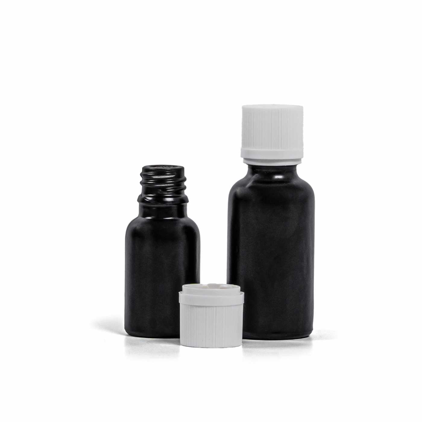 Die Glasflasche, das so genannte Fläschchen, ist aus dickem Glas in schwarzer, matter Ausführung gefertigt. Sie dient zur Aufbewahrung von Flüssigkeiten, die sie dank ihrer Farbe wirksam vor Licht schützt.
