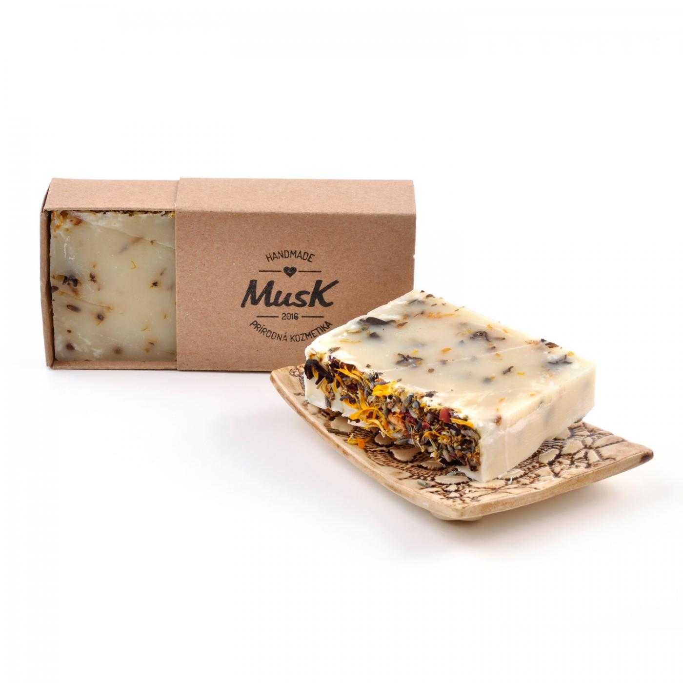 Die getrockneten Kräuter, die in der Seife enthalten sind, können dazu führen, dass sie sich etwas rau anfühlt, besonders wenn sie unter der Dusche verwendet wird. Dieses Gefühl ist jedoch nicht unangenehm und hält nur für die ersten 1 - 2 Waschgänge an, bis die Kräuter die Feuchtigkeit aufgenommen haben und weicher geworden sind. Danach ist der Peelingeffekt dieser Seife sehr angenehm :).Die sorgfältig ausgewählte Kombination von Ölen garantiert einen reichhaltigen und cremigen Schaum, die beigefügten ätherischen Öle hinterlassen einen zarten Duft auf Ihrer Haut. Wir sind Verfechter der Regel, dass weniger manchmal mehr ist, und deshalb finden Sie hier keine stark parfümierten Seifen, sondern subtile natürliche Düfte.Diese Seife eignet sich am besten, wenn Sie sie zwischen den Waschgängen schön trocken halten. Sie lässt sich leicht an einer Seifenschale aufhängen oder an einem Magneten, in einem Netz oder an einer Schnur befestigen. Sie werden mit einer längeren Haltbarkeit der Seife belohnt und haben länger Freude an der Verwendung der Seife.Alle unsere Seifen werden in Handarbeit im Kaltverfahren hergestellt. Dies ist die traditionelle Art der Seifenherstellung, bei der Öle und Butter mit einer Natriumhydroxidlösung vermischt werden und eine chemische Reaktion stattfindet, die wir Verseifung nennen. Die Seifen werden zusätzlich mit Kräutern, ätherischen Ölen, Vitaminen, Farbstoffen, kosmetischen Tonen und verschiedenen anderen Zutaten angereichert. Jede Seife muss an der Luft reifen, idealerweise mindestens 4 Wochen lang, bis sie den richtigen pH-Wert erreicht hat, bevor wir sie verpacken und an Sie versenden.Die Seifen werden in kleinen Chargen hergestellt, so dass einzelne Chargen in Design, Farbe oder Duft leicht voneinander abweichen können.Alle unsere Seifen werden in der Slowakei hergestellt und haben sowohl mikrobiologische als auch dermatologische Tests bestanden und erfüllen alle gesetzlichen Anforderungen für kosmetische Produkte. Wir haben eine Sicherheitsbewertung für kosmetische Produkte und die Seifen sind auch auf dem CPNP-Portal gemeldet.Die Abmessungen der Seife betragen etwa 8 x 6 x 2,5-3 cm.Das Gewicht der Seife beträgt 100 g ± 5 g.Zusammensetzung der Seife (INCI):Sodium Oleate (verseiftes Olivenöl), Sodium Cocoate (verseiftes Kokosnussöl), Sodium Sunflower Seedate (verseiftes Sonnenblumenöl), Sodium Cocoa Butterate (verseifte Kakaobutter), Glycerin (Glycerin), Pelargonium Graveolens Flower Oil (EO Geranium), Lavandua Angustifolia Oil (EO Lavender), Cymbopogon Martini Oil (EO Palmarosa), Aqua (Wasser), Sambucus Nigra Flower (Black Elderflower), Jasminum Fruticans Flower (Jasmine Flower), Lavandula Angustifolia Blume (Lavendel Blume), Calendula Officinalis Blume (Ringelblume Blume), Paeonia Officinalis Blume (Pfingstrose Blume), Rosa Canina Blume (Rose Blume), Geraniol**, Linalool**, Citronellol**, Citral**, Limonene**, Farnesol**, Eau de Toilette**, Eau de Toilette**, Eau de Toilette**, Eau de Toilette**, Eau de Toilette**, Eau de Toilette**, Eau de Toilette**, Eau de Toilette**, Eau de Toilette**, Eau de Toilette**** natürlich enthalten in ätherischen Ölen
